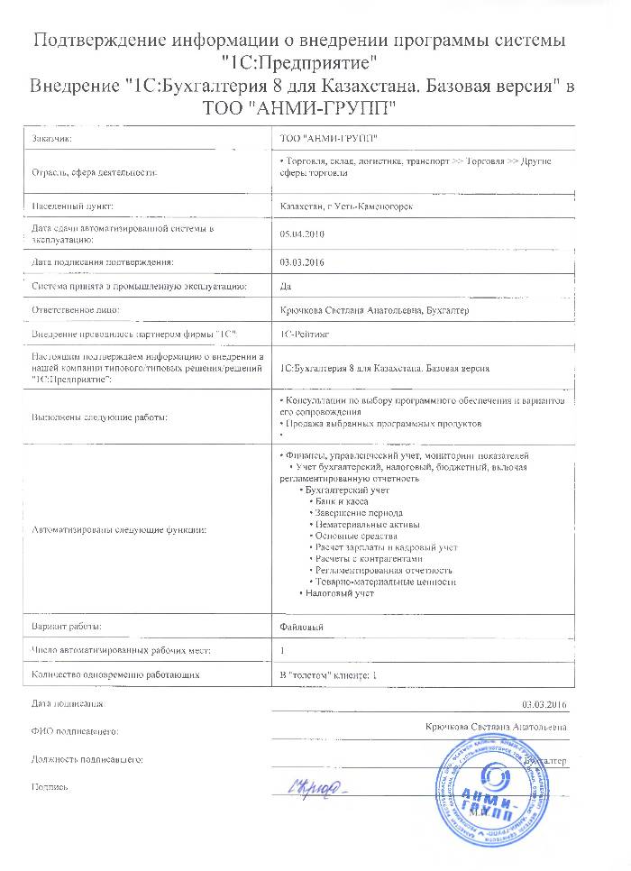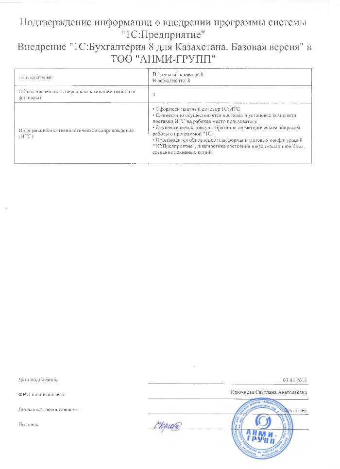 | Внедренное типовое решение: | 1С:Бухгалтерия 8 для Казахстана. Базовая версия |