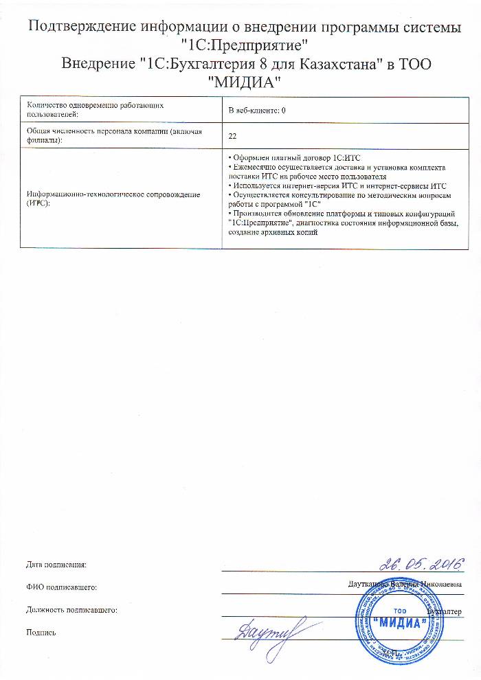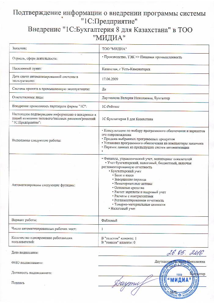 | Внедренное типовое решение: | 1С:Бухгалтерия 8 для Казахстана |