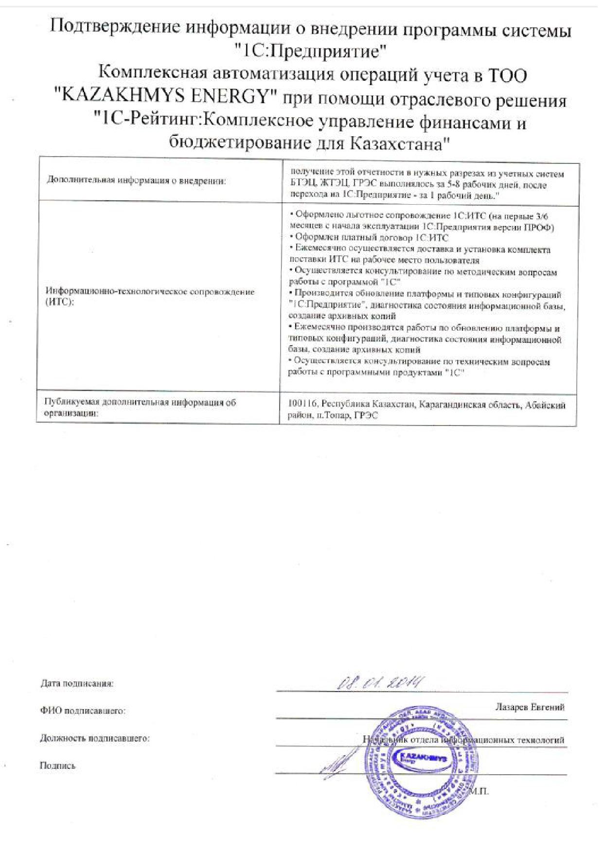 | Внедренное отраслевое решение: | 1С-Рейтинг: Комплексное управление финансами и бюджетирование для Казахстана |