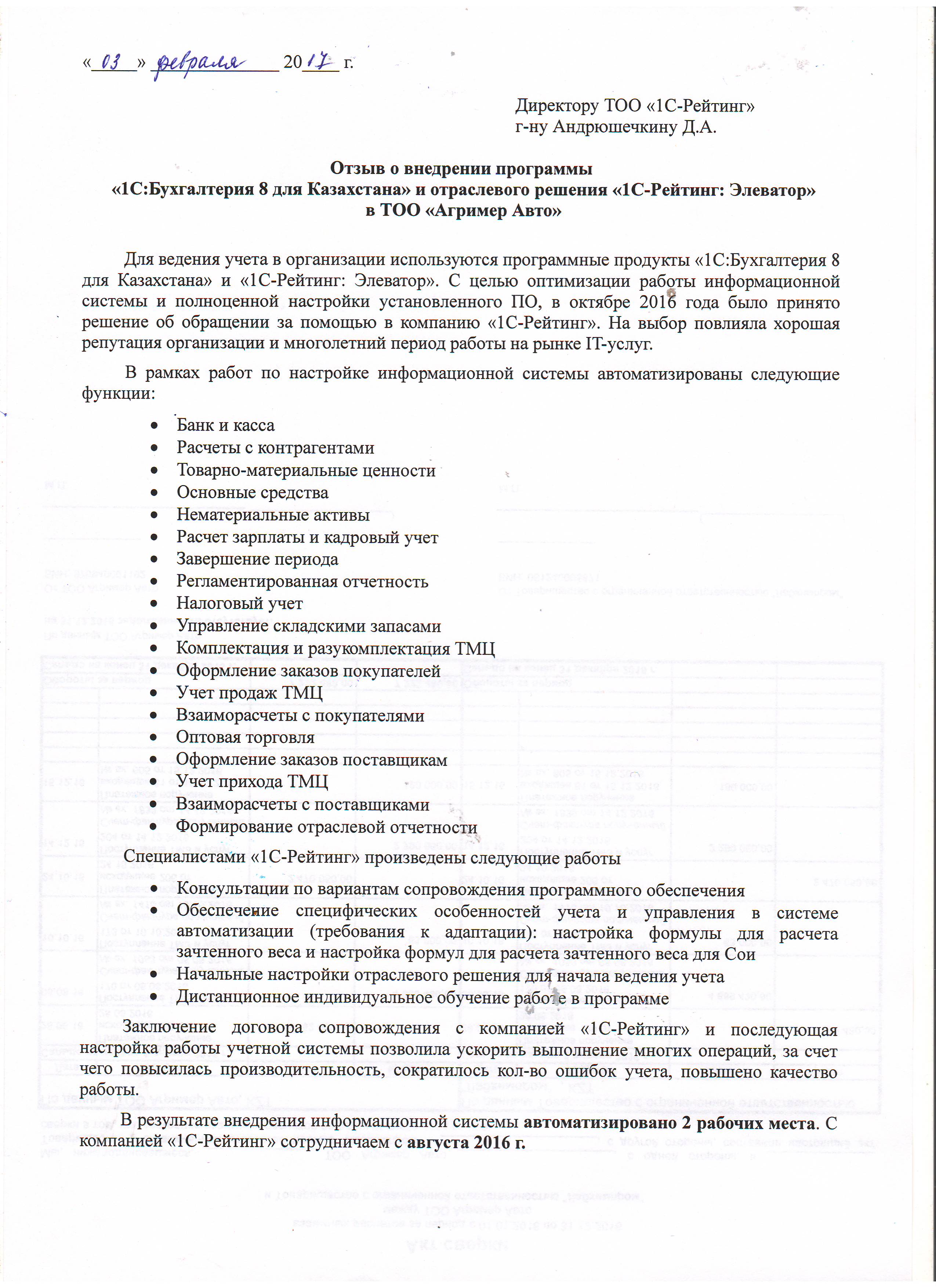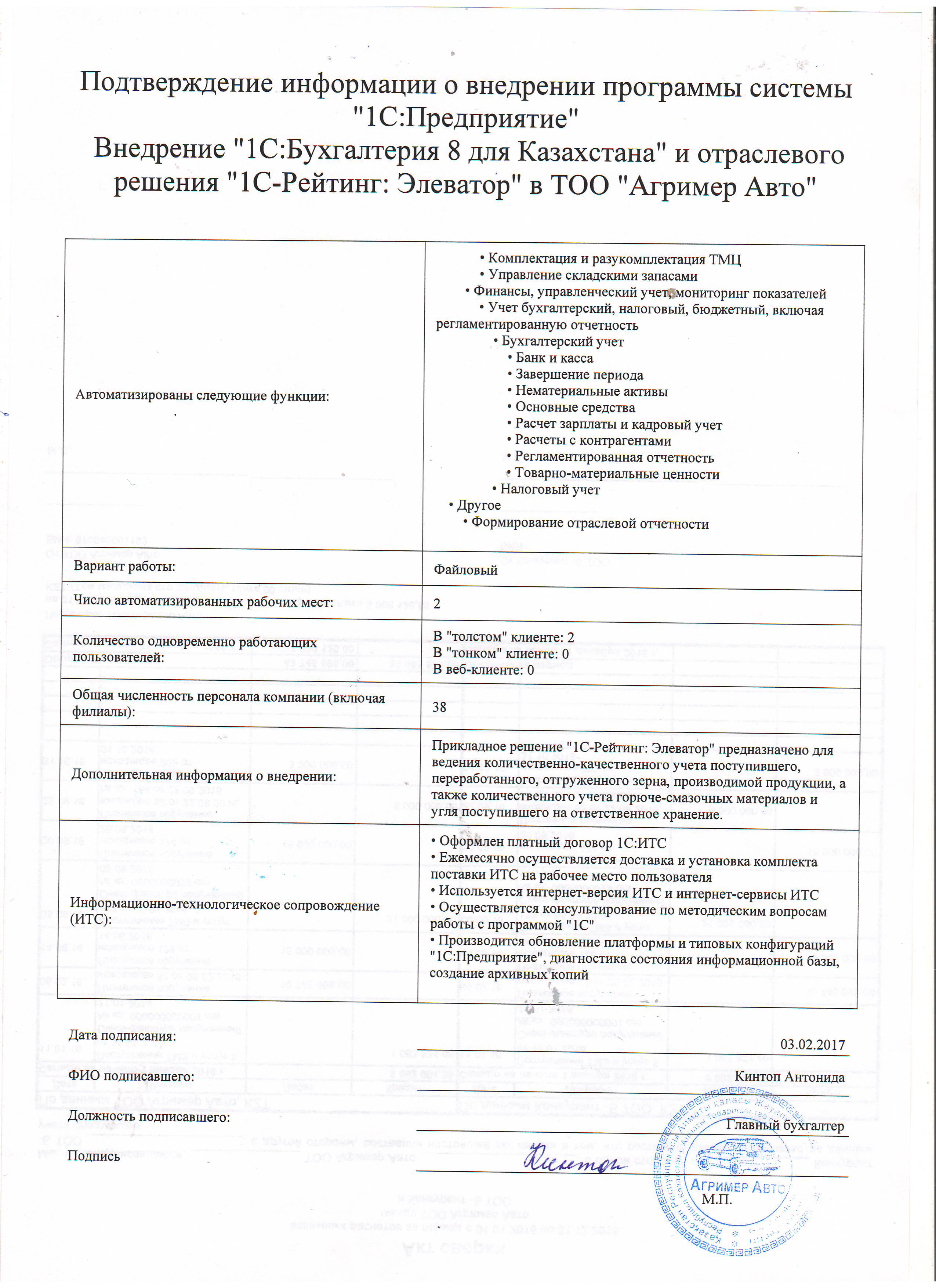 Внедрение «1С:Бухгалтерия 8 для Казахстана» и отраслевого решения «1С-Рейтинг: Элеватор» в ТОО «Агример Авто»
