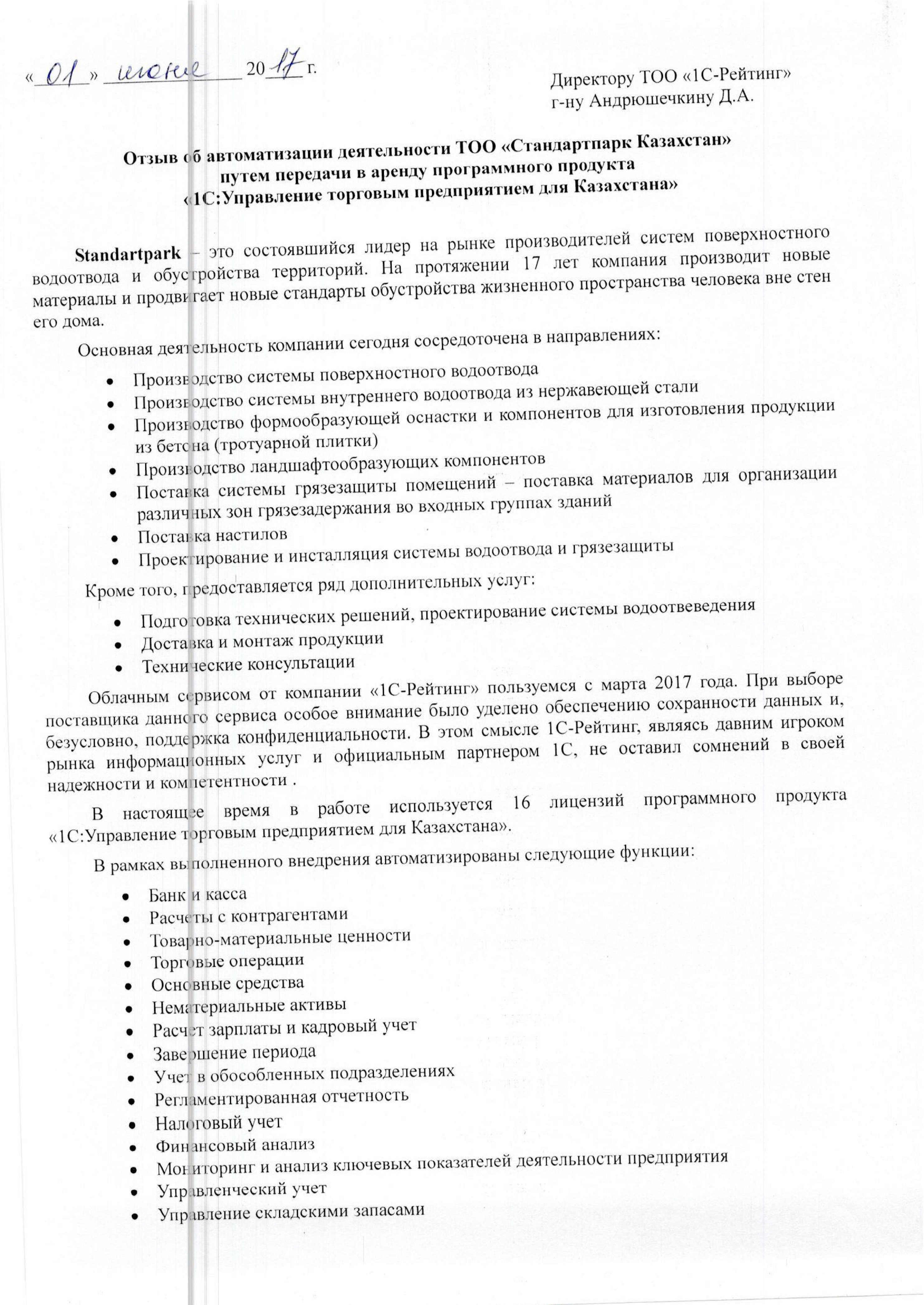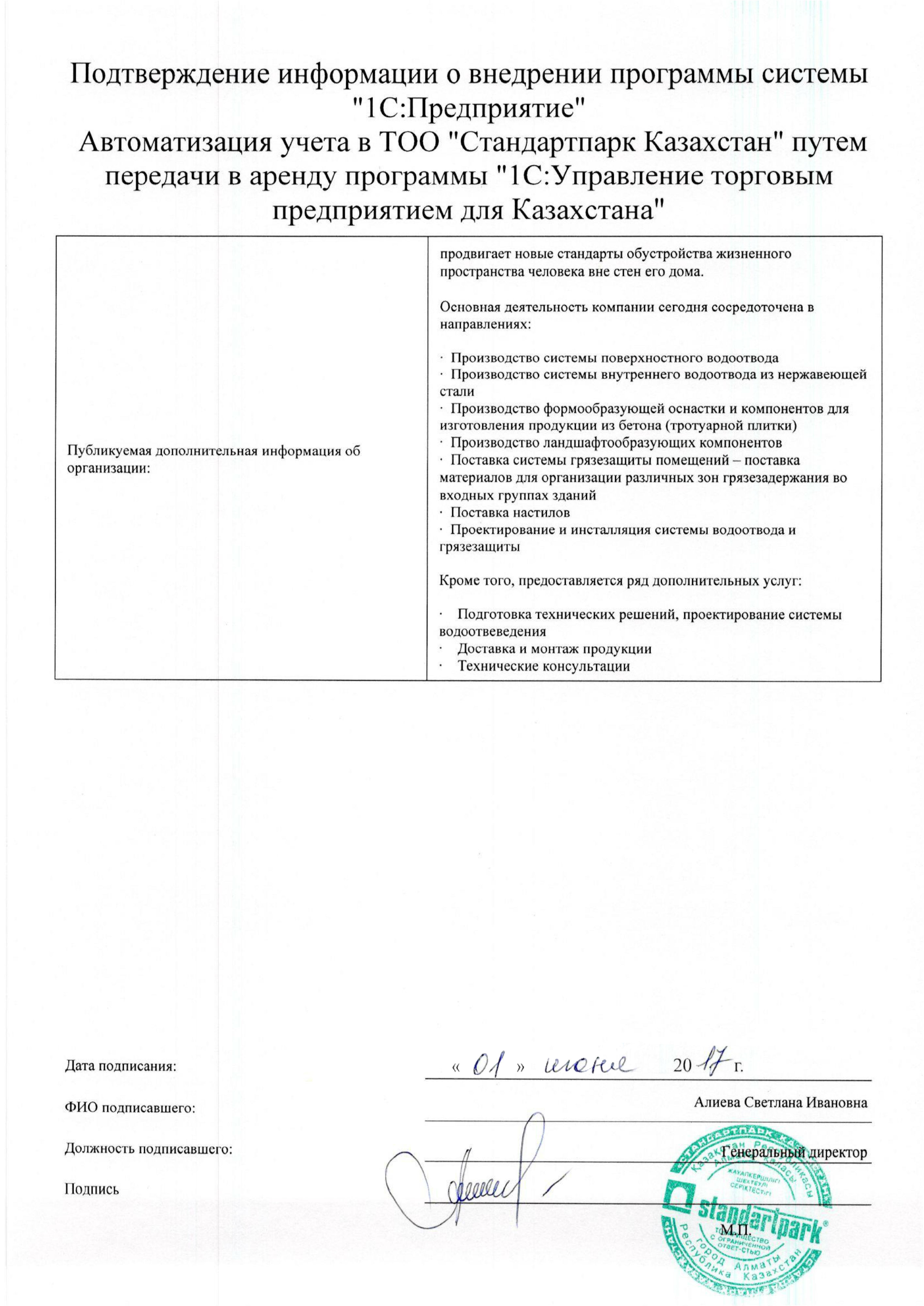 ТОО «Стандартпарк Казахстан» ─ это состоявшийся лидер на рынке производителей систем поверхностного водоотвода и обустройства территорий. На протяжении 17 лет компания производит новые материалы и продвигает новые стандарты обустройства жизненного пространства человека вне стен его дома.