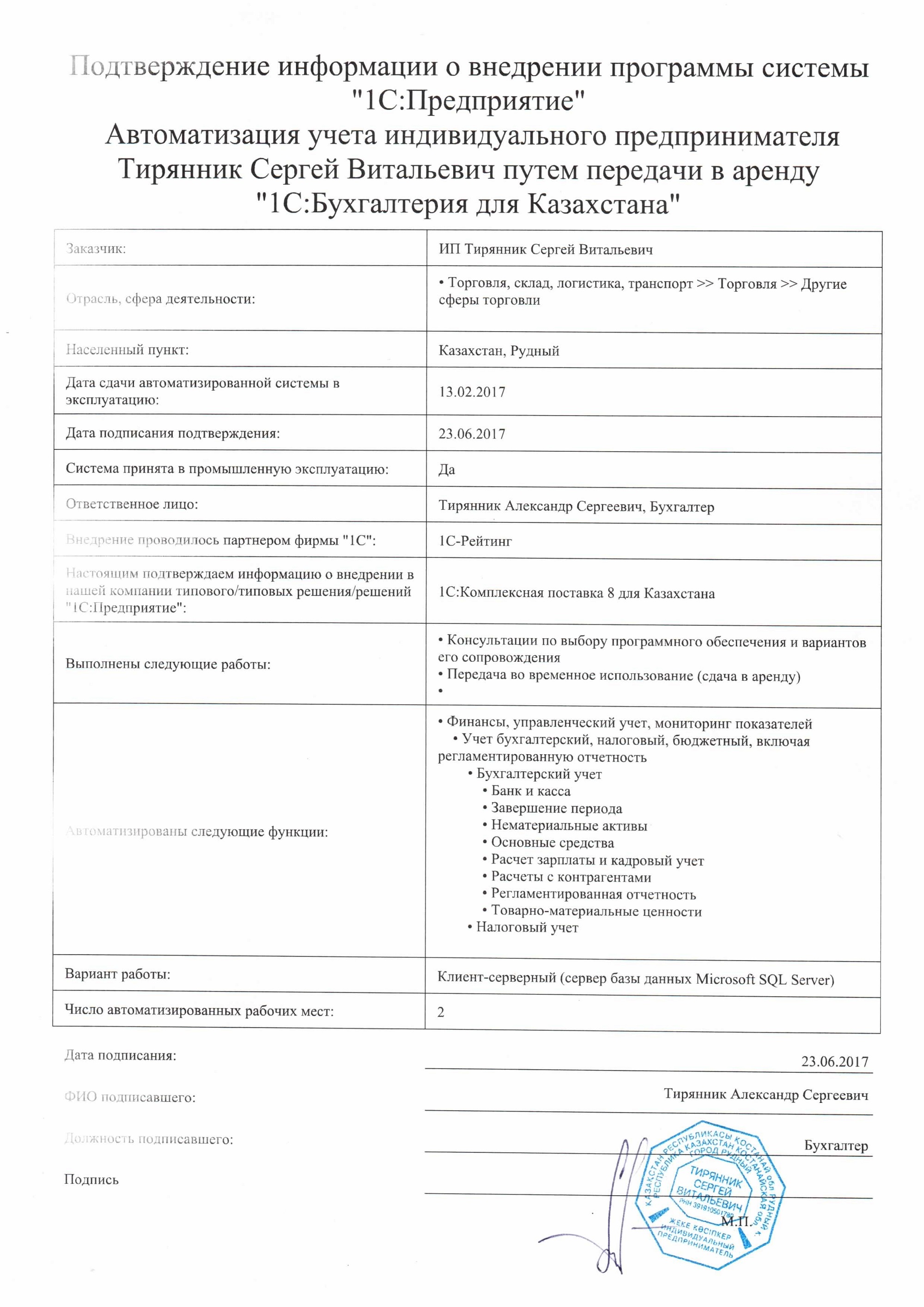 | Арендованное типовое решение: | 1С:Бухгалтерия для Казахстана |