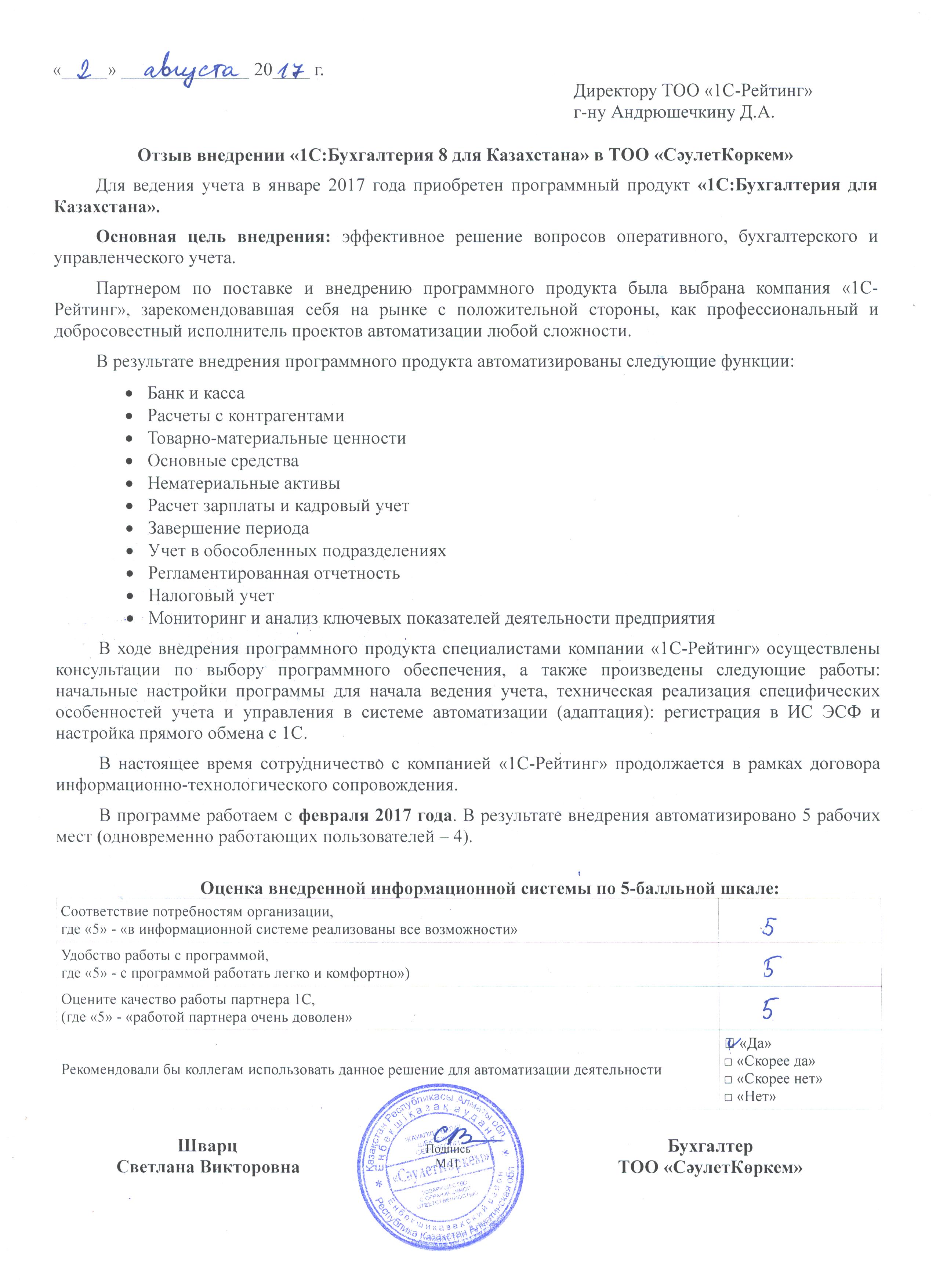 | Внедренное типовое решение: | 1С:Бухгалтерия 8 для Казахстана |