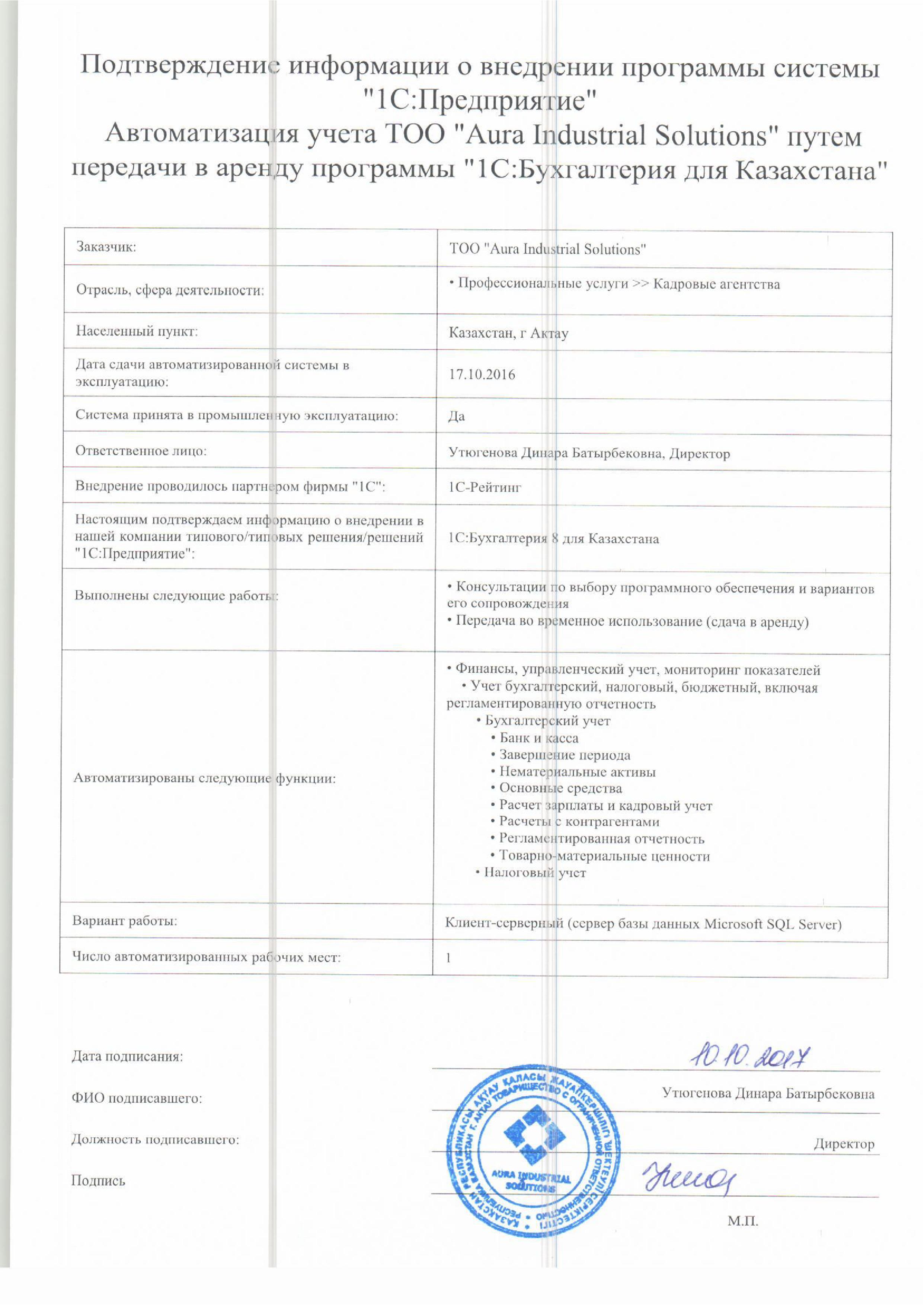 | Арендованное типовое решение: | 1С:Бухгалтерия для Казахстана |