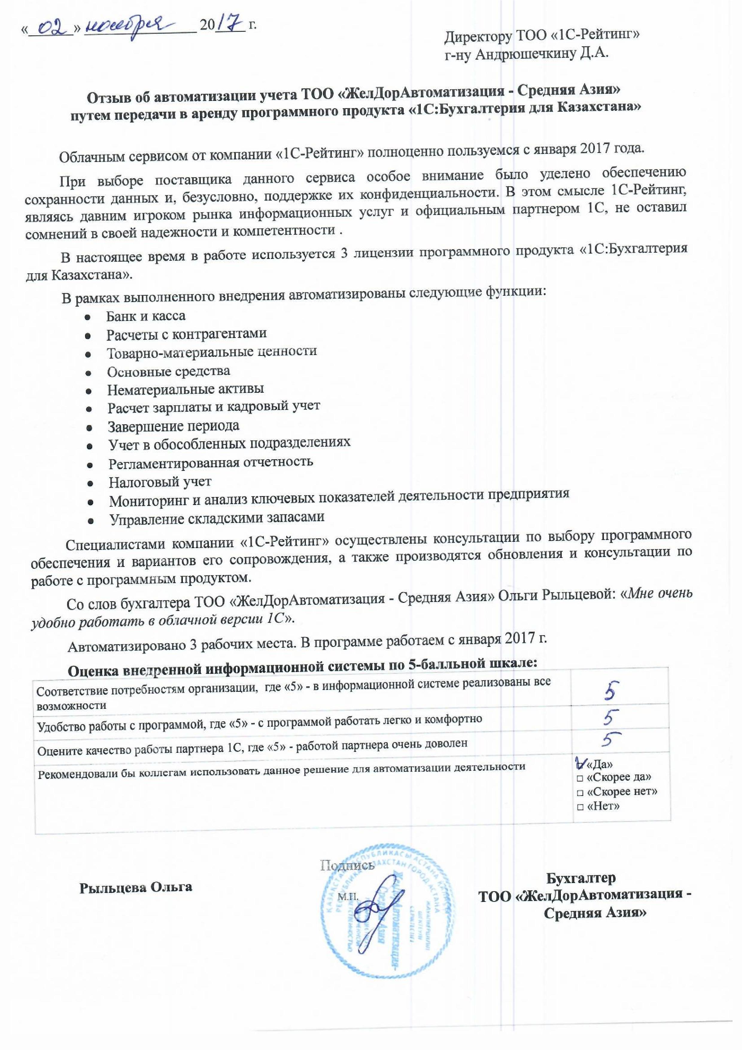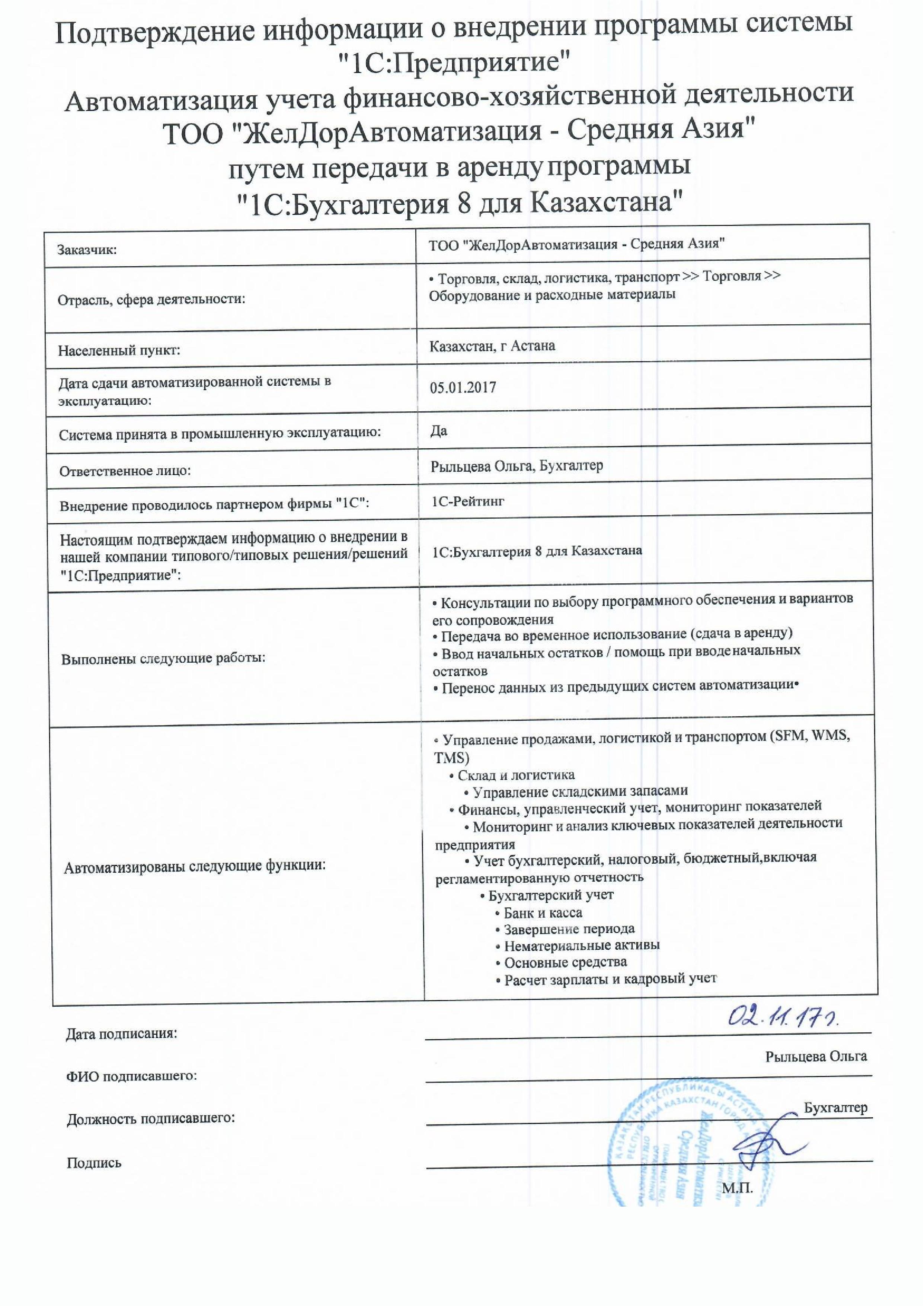 Автоматизация учета финансово-хозяйственной деятельности ТОО «ЖелДорАвтоматизация - Средняя Азия» путем передачи в аренду программы «1С:Бухгалтерия для Казахстана»