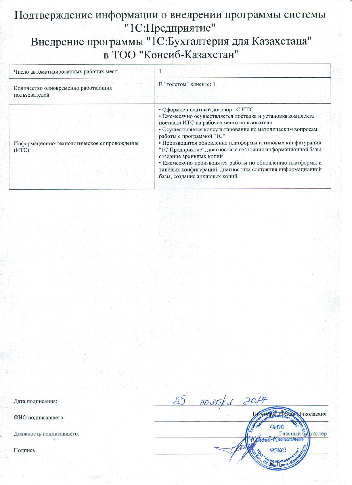 | Внедренное типовое решение: | 1С:Бухгалтерия 8 для Казахстана |