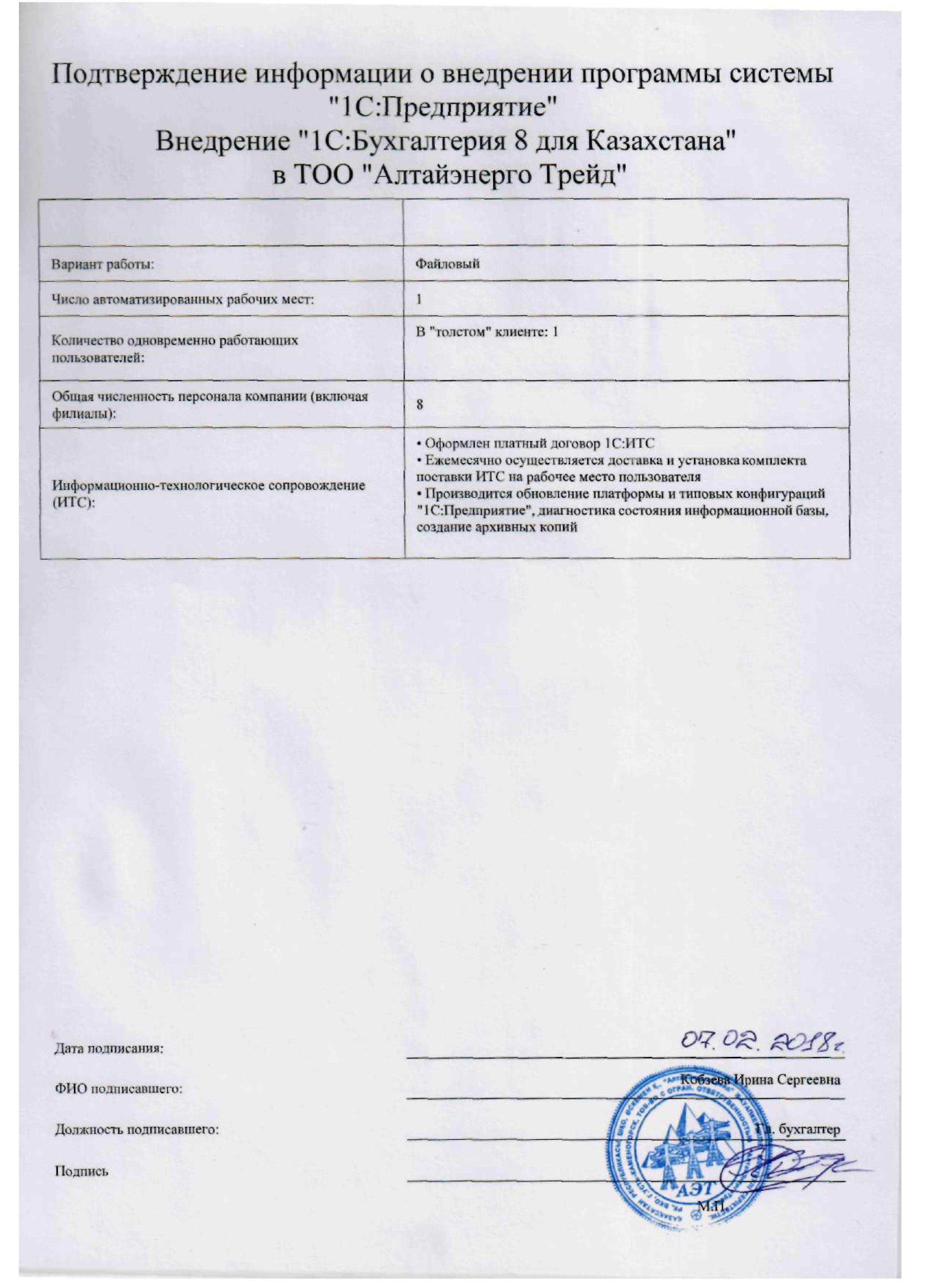 | Внедренное типовое решение: | 1С:Бухгалтерия 8 для Казахстана |