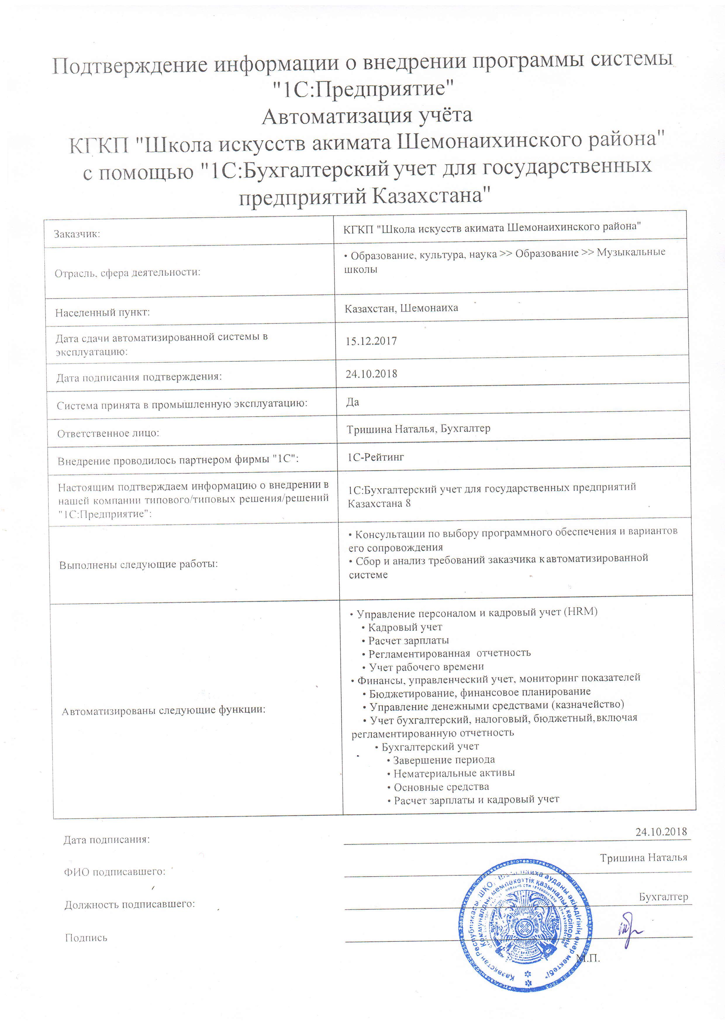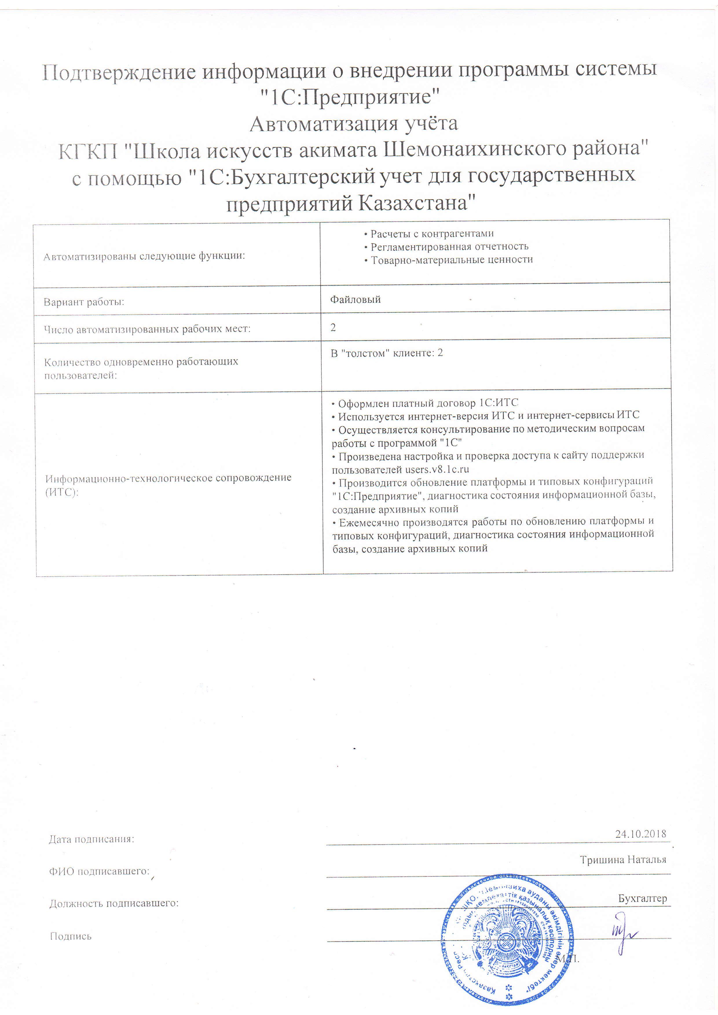 | Внедренное типовое решение: | 1С:Бухгалтерский учет для государственных предприятий Казахстана |