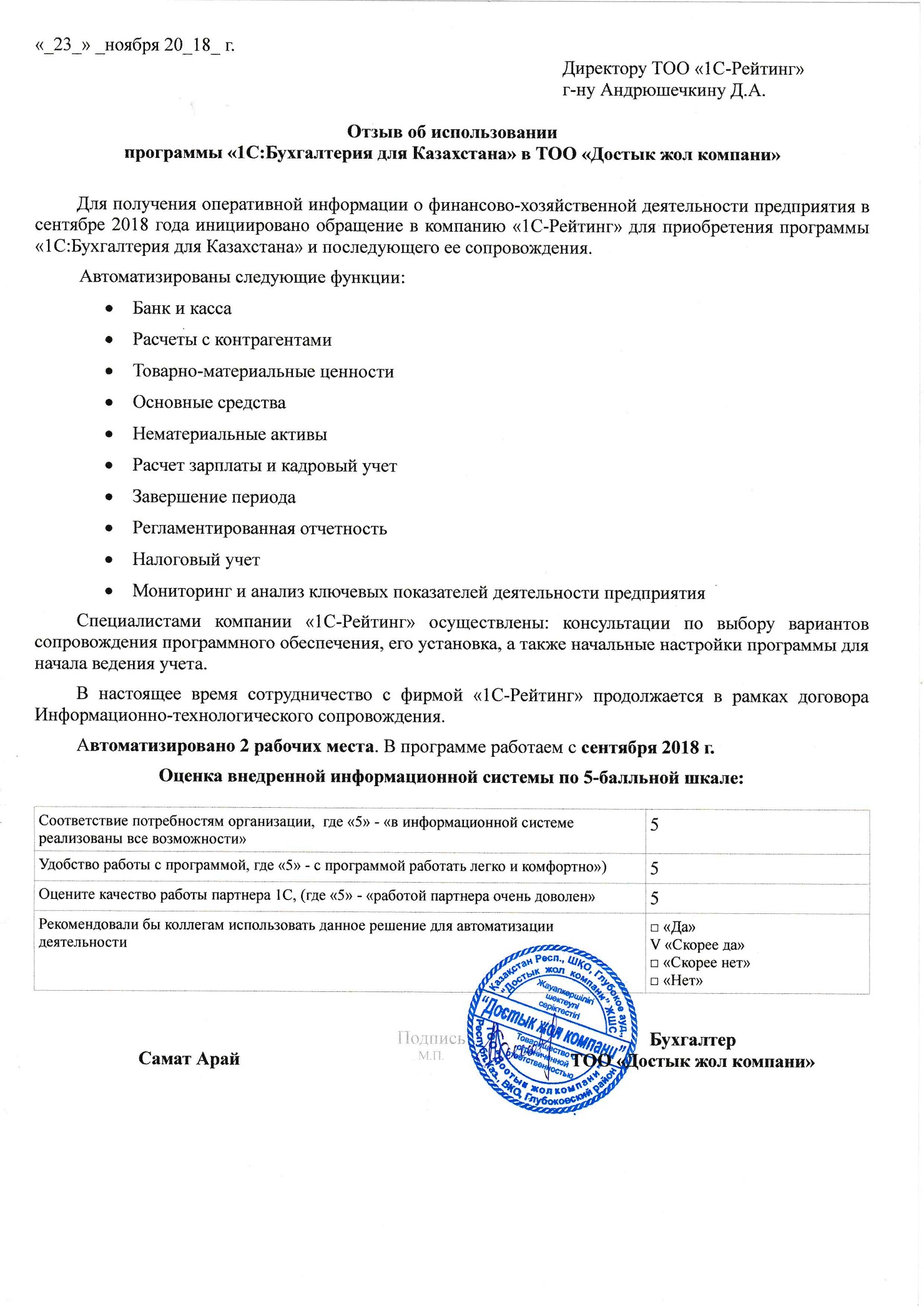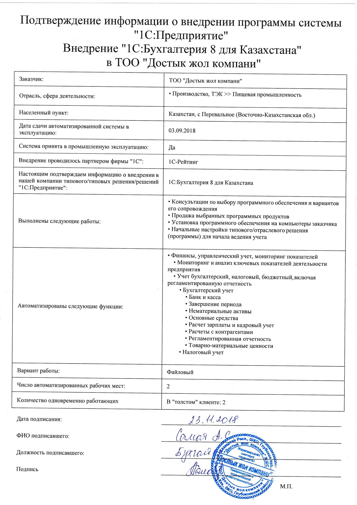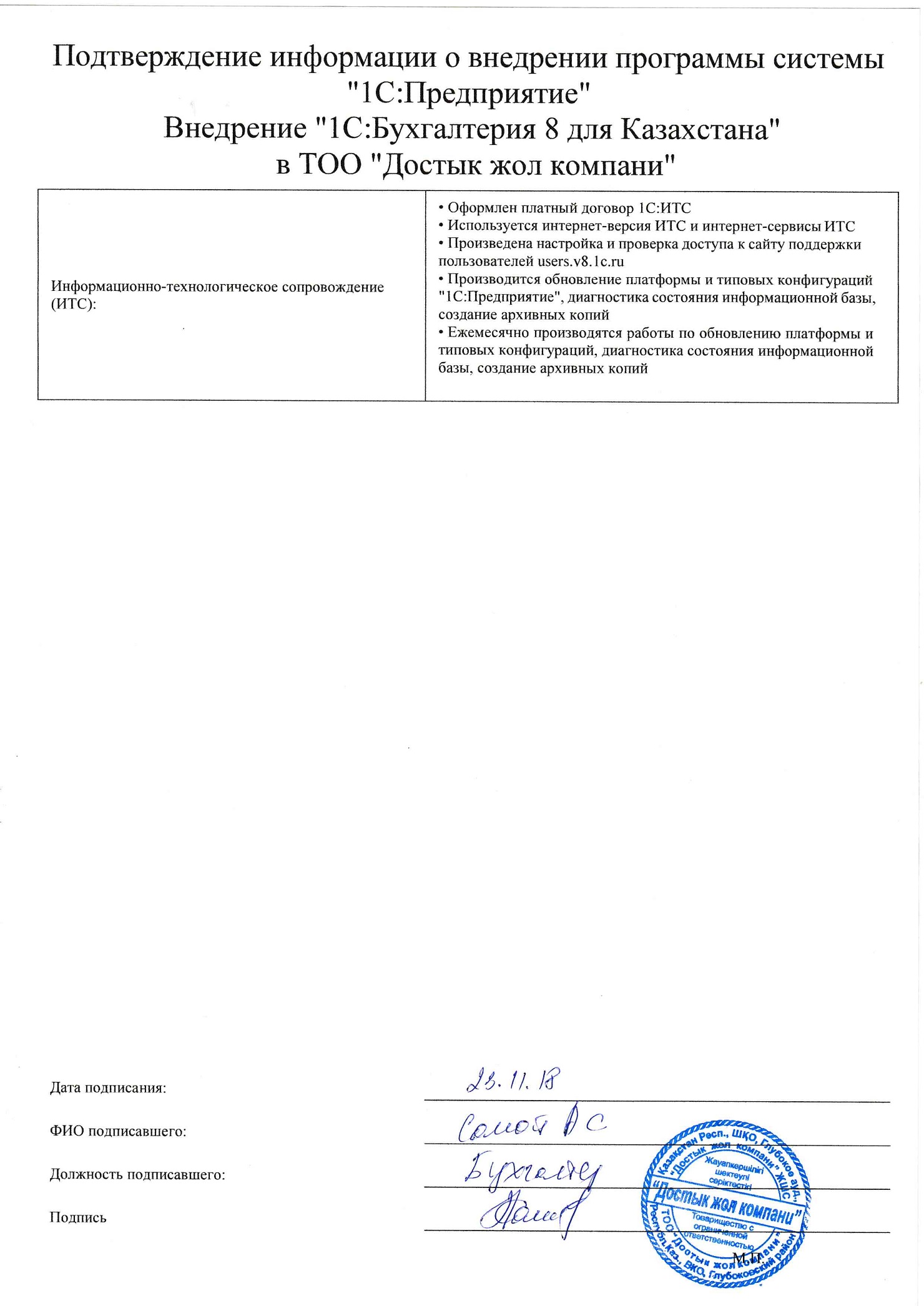 Внедрение «1C:Бухгалтерия 8 для Казахстана» в ТОО «Достык жол компани»