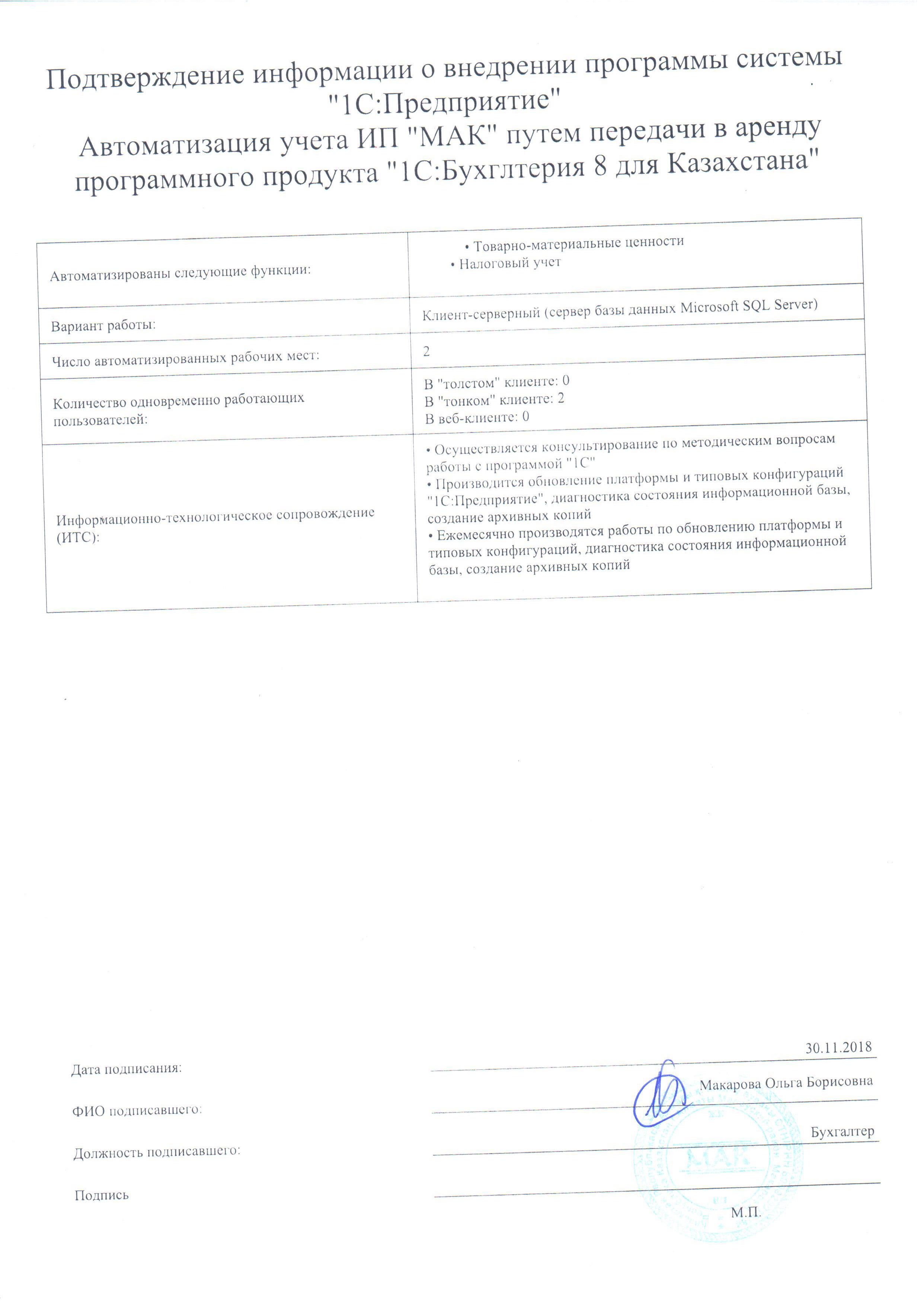 - Ежемесячно производятся работы по обновлению платформы и типовых конфигураций, диагностика состояния информационной базы, создание архивных копий