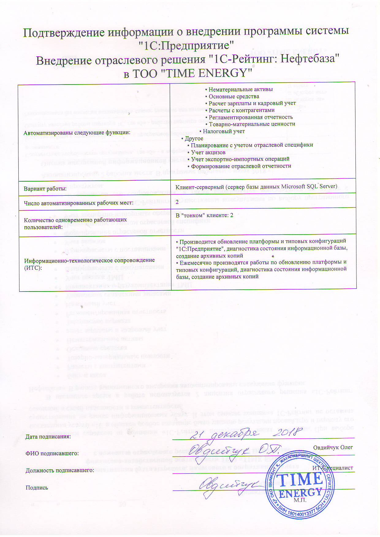 | Внедренное отраслевое решение: | 1С-Рейтинг: Нефтебаза |