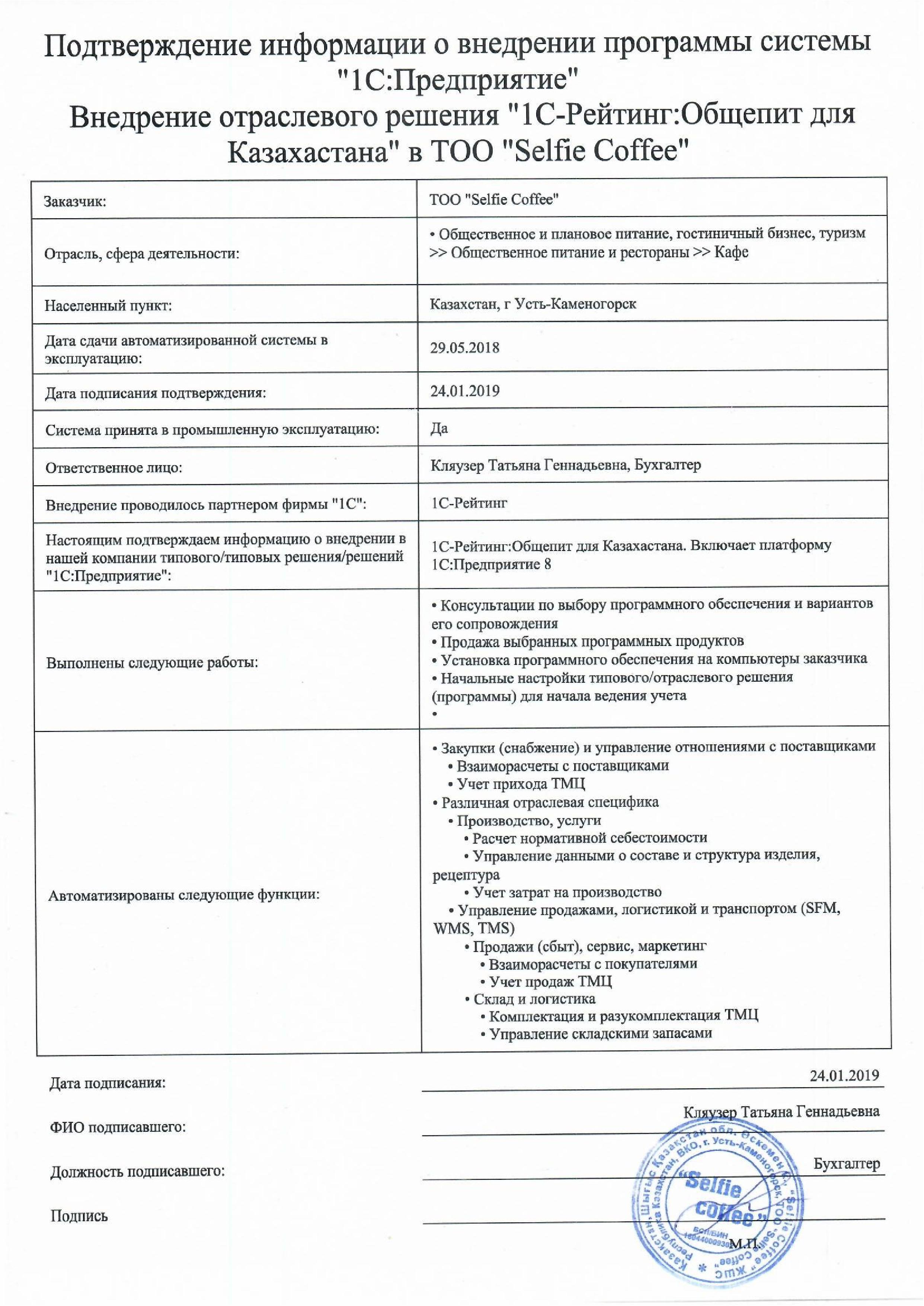 | Внедренное отраслевое решение: | 1С-Рейтинг: Общепит для Казахстана |