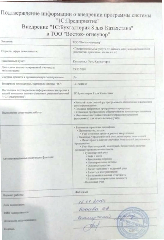 | Внедренное типовое решение: | 1С:Бухгалтерия 8 для Казахстана |