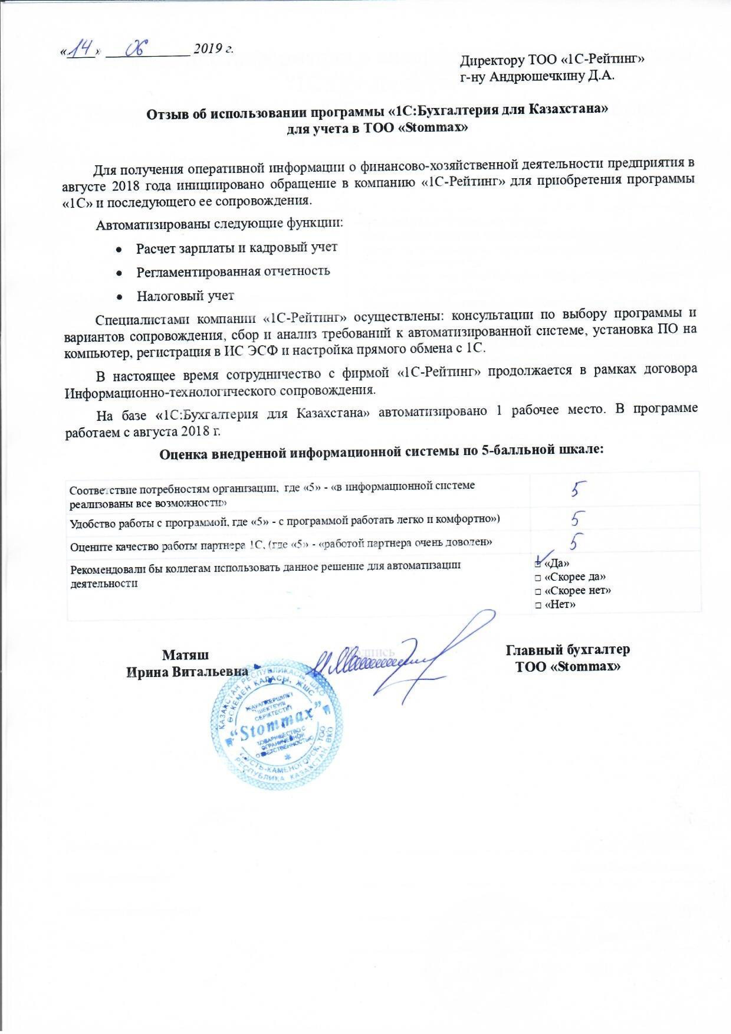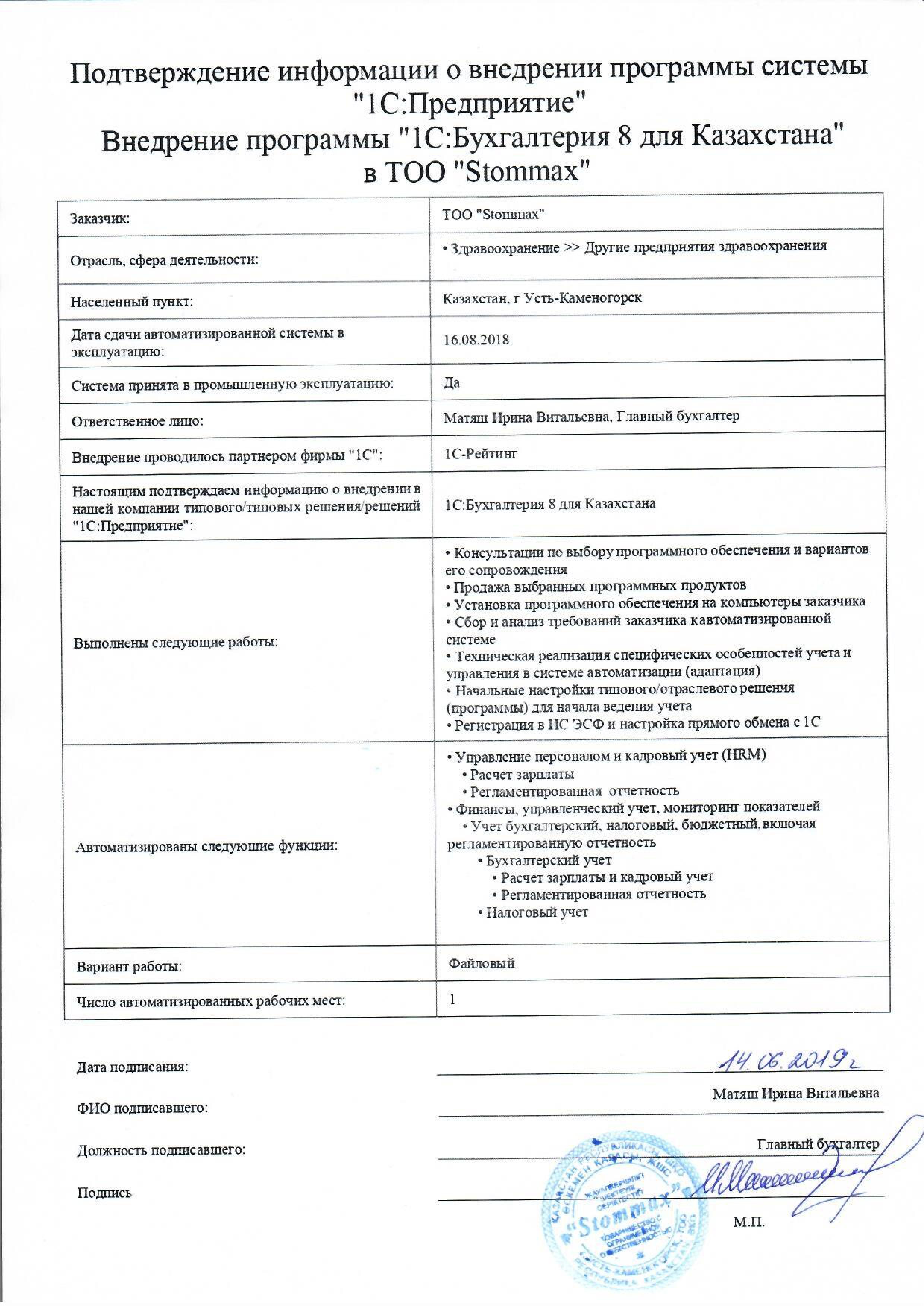 | Внедренное типовое решение: | 1С:Бухгалтерия 8 для Казахстана |