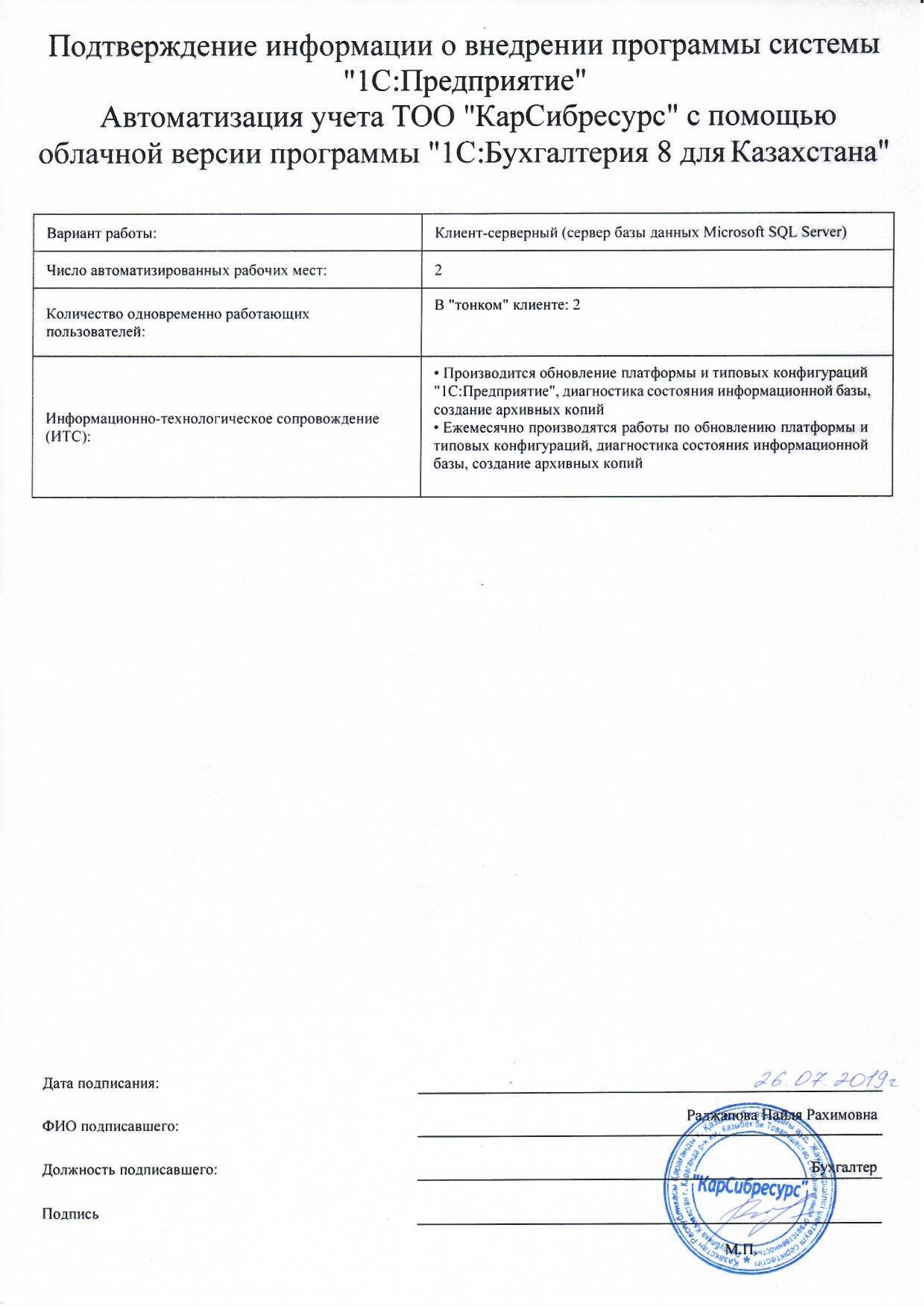 | Арендованное типовое решение: | 1С:Бухгалтерия для Казахстана |
