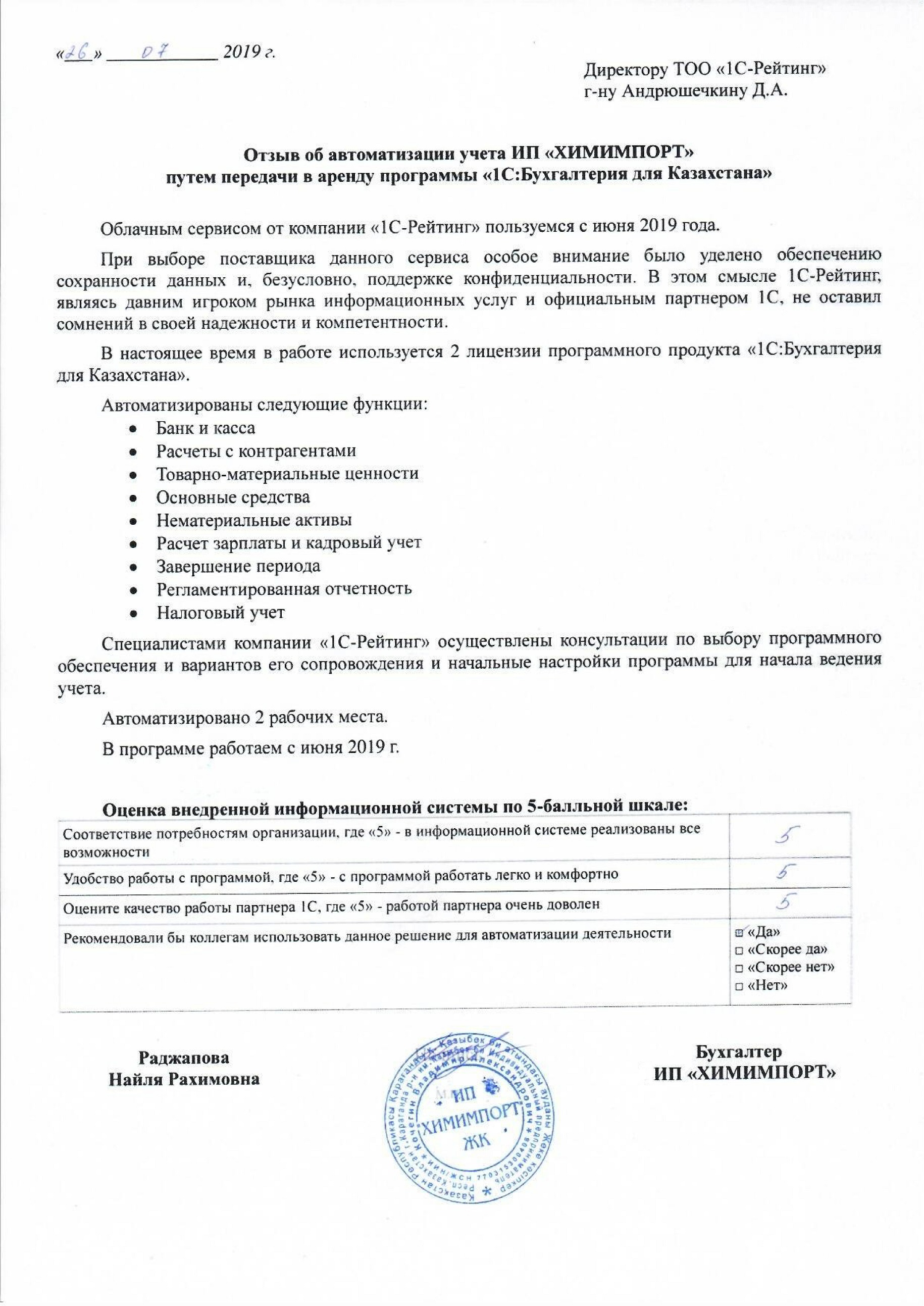 | Арендованное типовое решение: | 1С:Бухгалтерия для Казахстана |