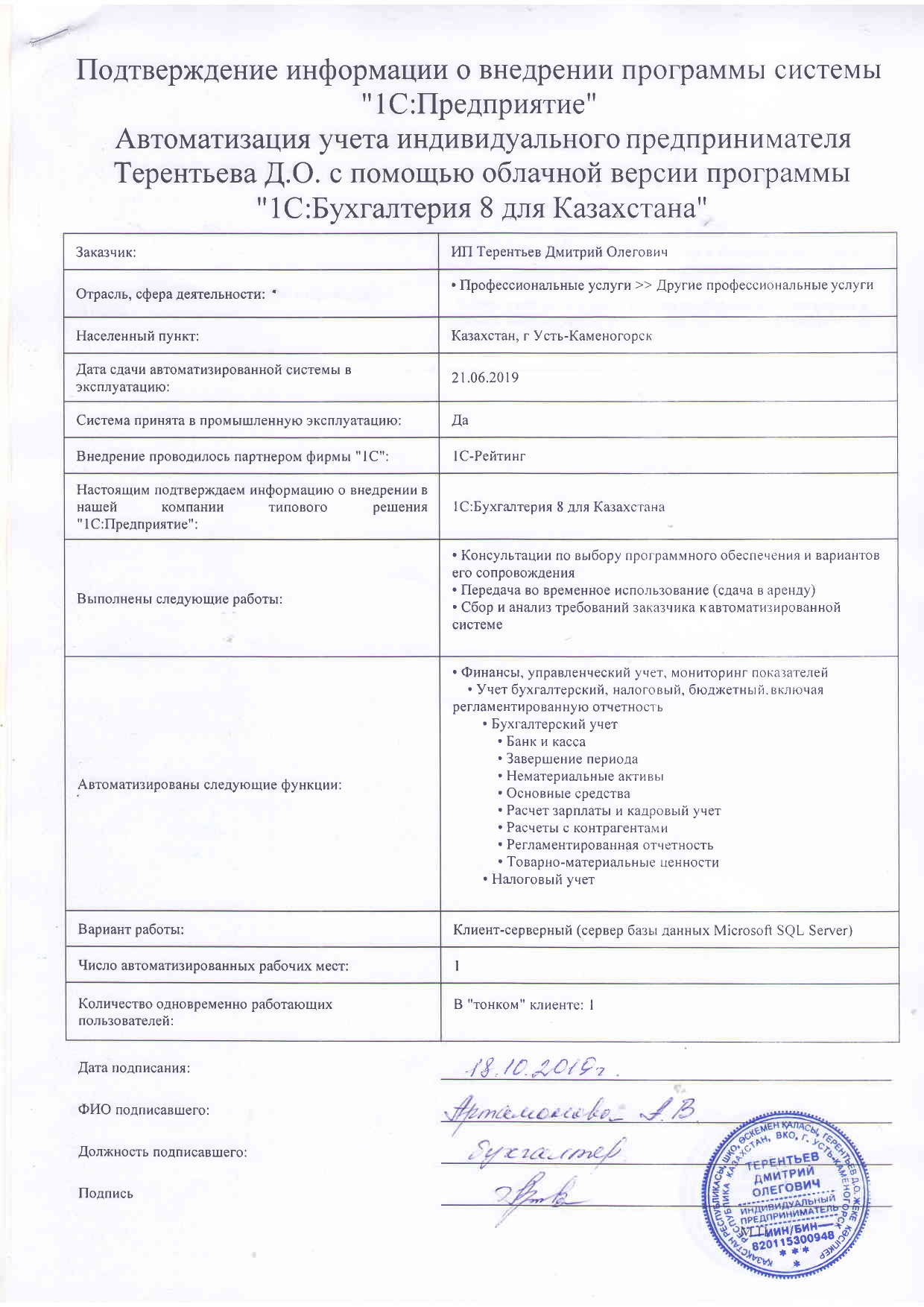 | Арендованное типовое решение: | 1С:Бухгалтерия для Казахстана |