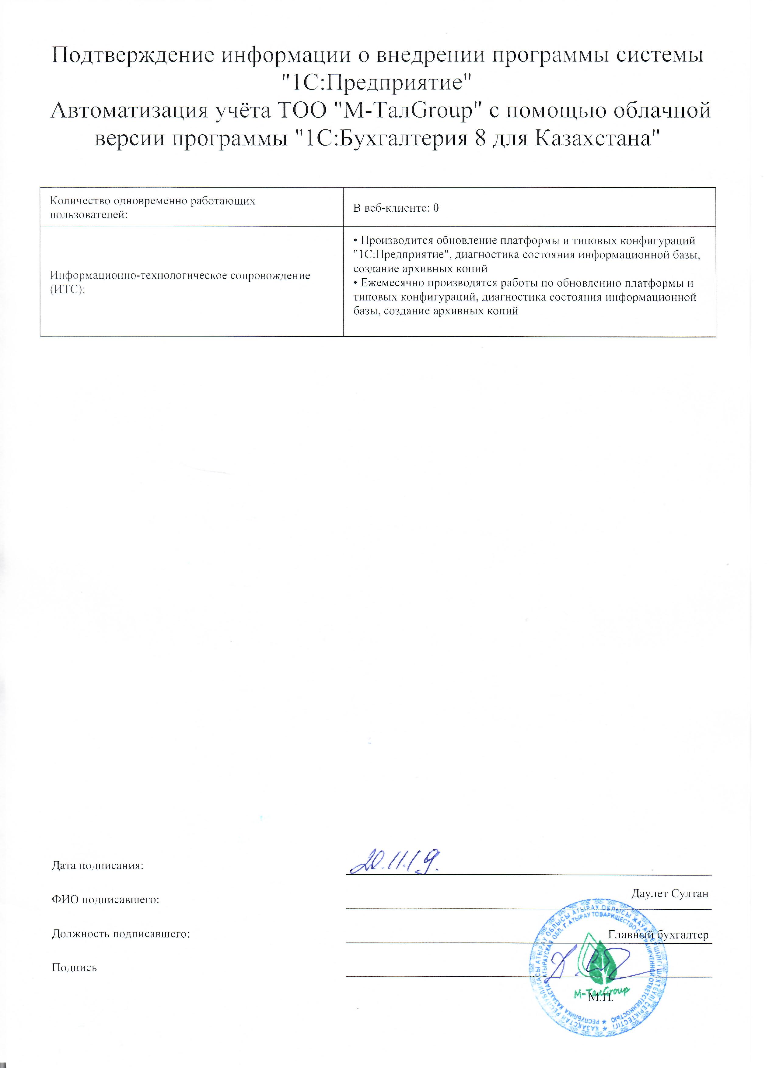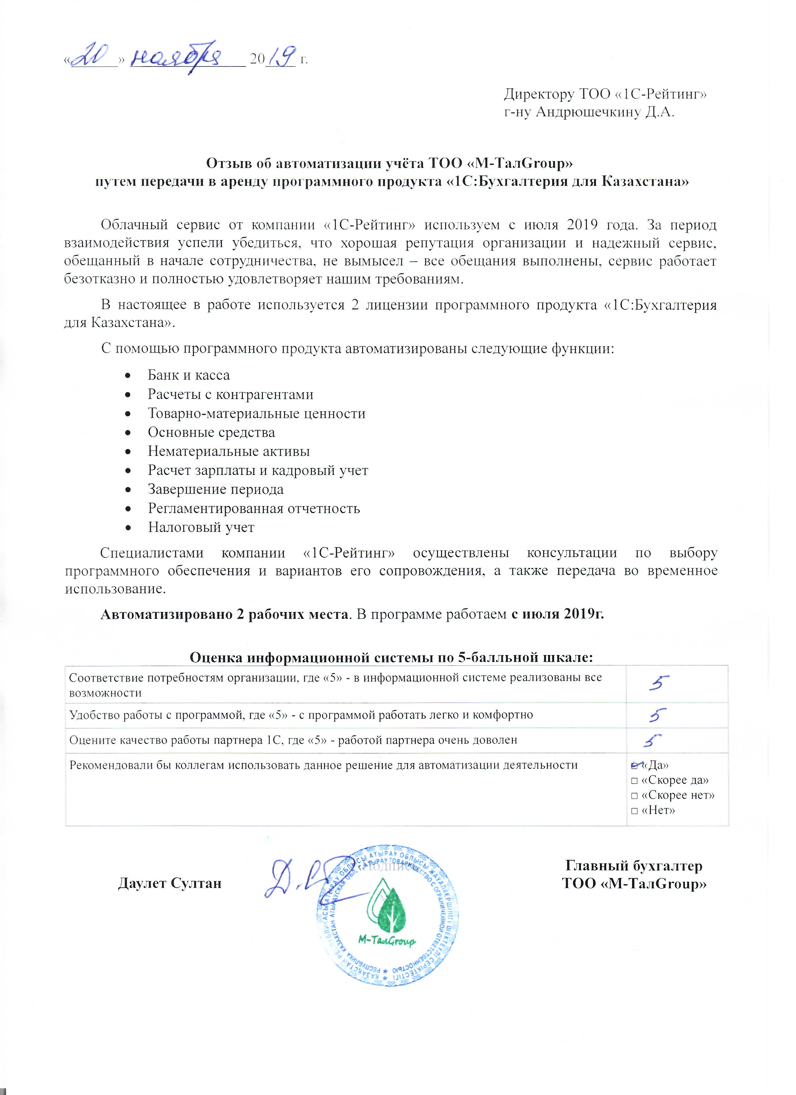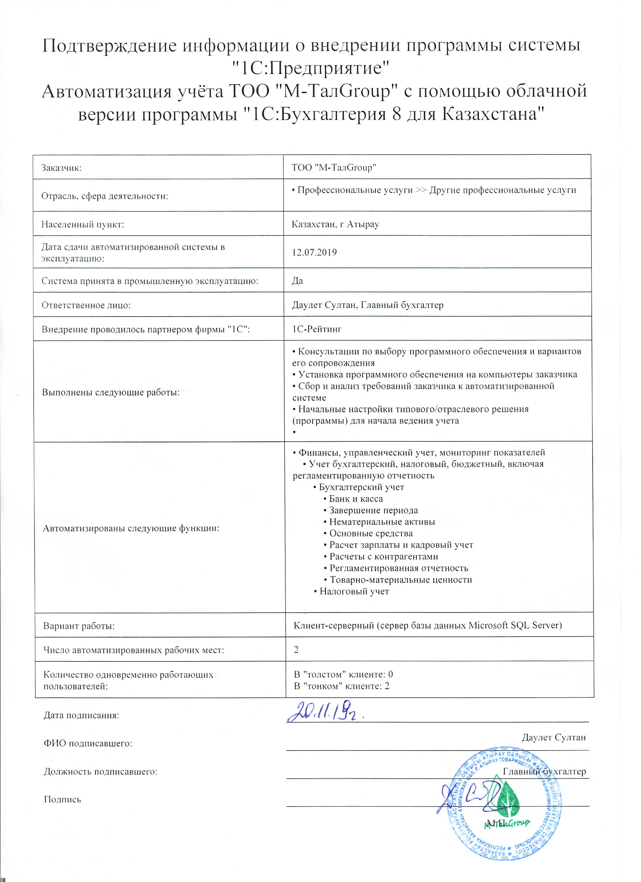 Автоматизация учёта ТОО «М-ТалGroup» с помощью облачной версии программы «1С:Бухгалтерия для Казахстана»
