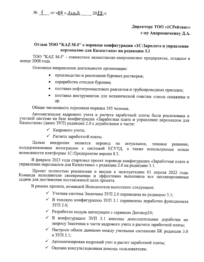 ТОО «KAZ M-I» перевод конфигурации «1С:Зарплата и управление персоналом для Казахстана» на редакцию 3.1
