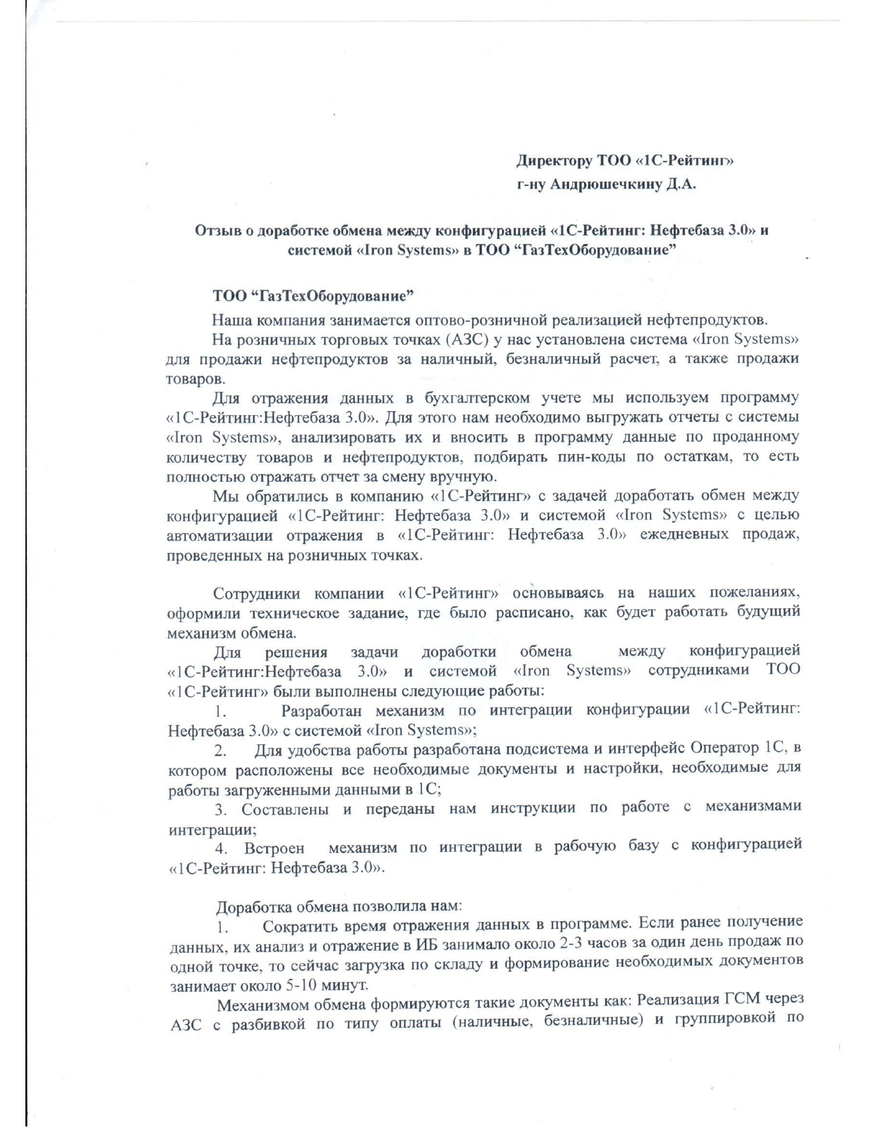 - Интеграция двух систем «1С-Рейтинг: Нефтебаза 3.0» и «Iron Systems» с целью автоматизации отражения в «1С-Рейтинг: Нефтебаза 3.0» ежедневных продаж, проведенных на розничных точках.