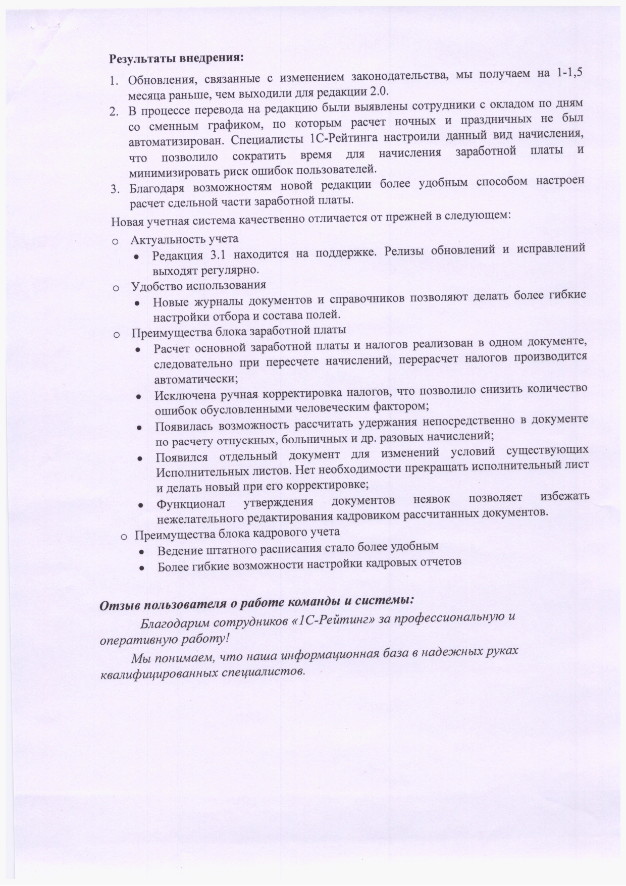 Заметны значительные улучшения в процессах управления персоналом и начисления заработной платы, а именно: