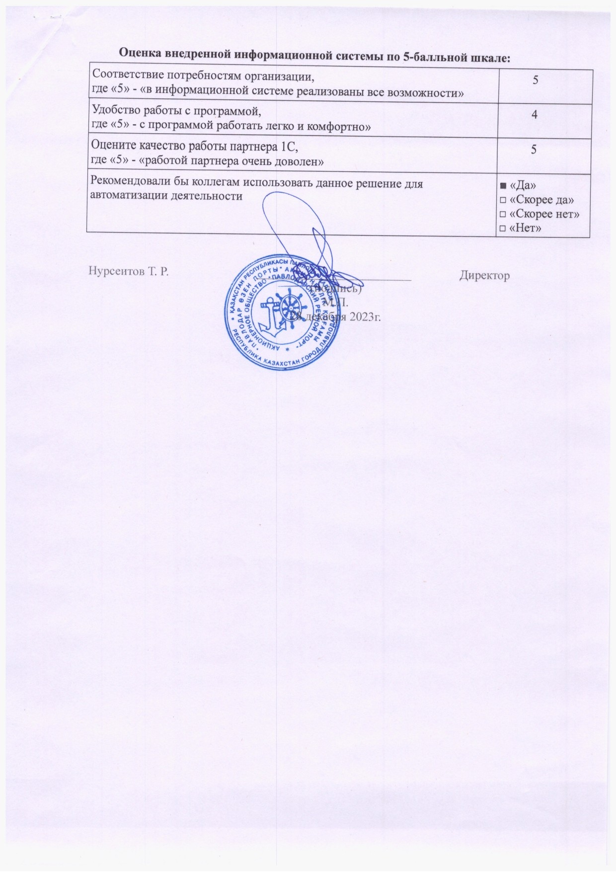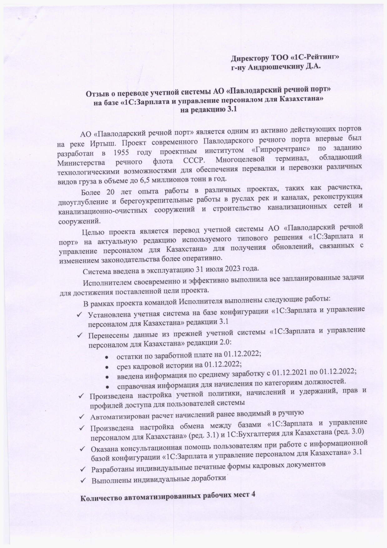 Перевод учетной системы АО «Павлодарский речной порт» на актуальную редакцию используемого типового решения «1С:Зарплата и управление персоналом для Казахстана» для получения обновлений, связанных с изменением законодательства более оперативно.