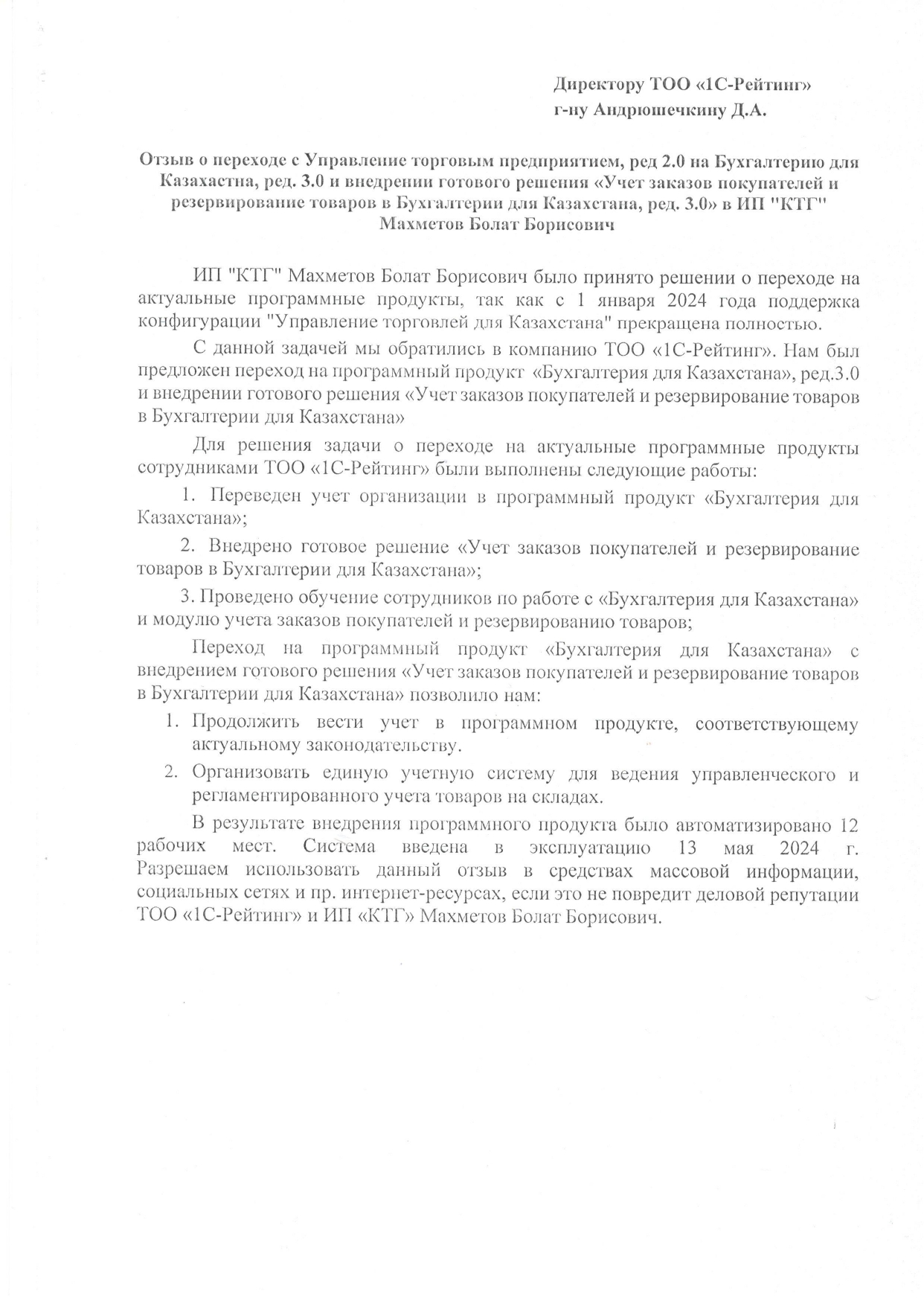 Для решения задачи о переходе на актуальные программные продукты сотрудниками ТОО «1С-Рейтинг» были выполнены следующие работы: