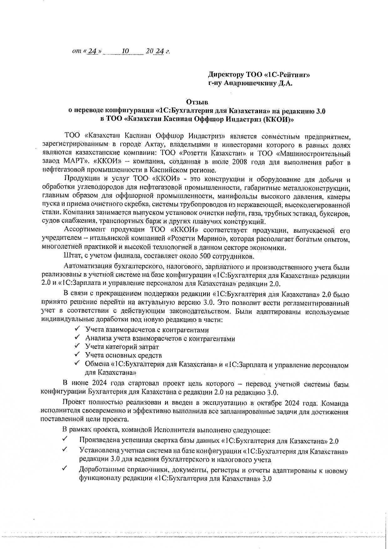 ТОО «Казахстан Каспиан Оффшор Индастриз» является совместным предприятием, зарегистрированным в городе Актау, владельцами и инвесторами которого в равных долях являются казахстанские компании: ТОО «Розетти Казахстан» и ТОО «Машиностроительный завод МАРТ». «ККОИ» – компания, созданная в июле 2008 года для выполнения работ в нефтегазовой промышленности в Каспийском регионе.