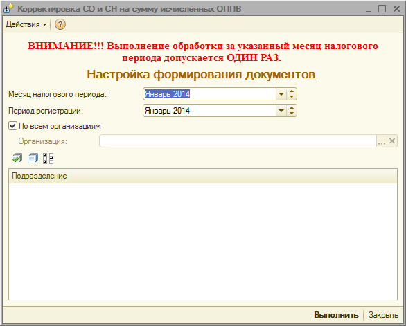 При нажатии на кнопку «Выполнить» в программе формируются документы, корректирующие суммы исчисленных СО и СН.
