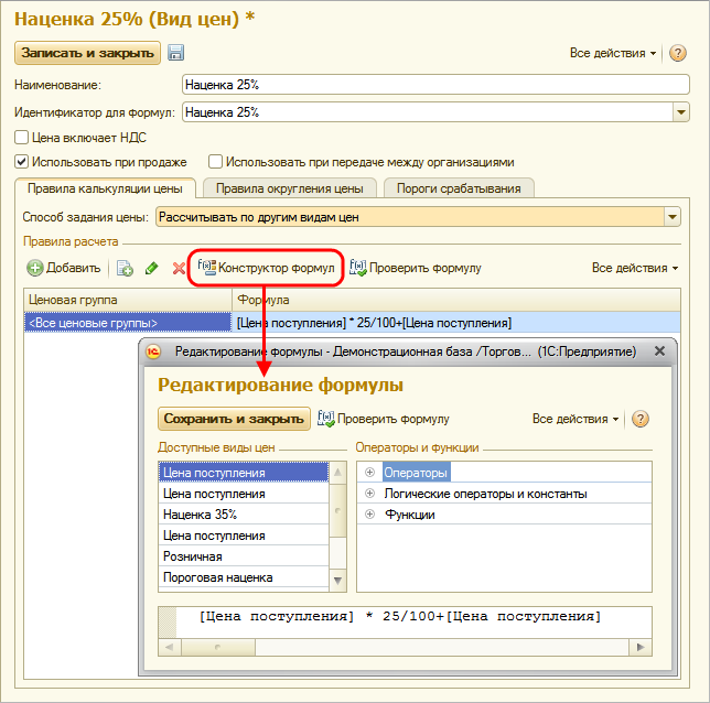 - Для расчета цены на основании других цен используются формулы. Формула может быть введена вручную, с помощью конструктора формул или с помощью мастера формирования наценок, который специально разработан для облегчения ввода формул;