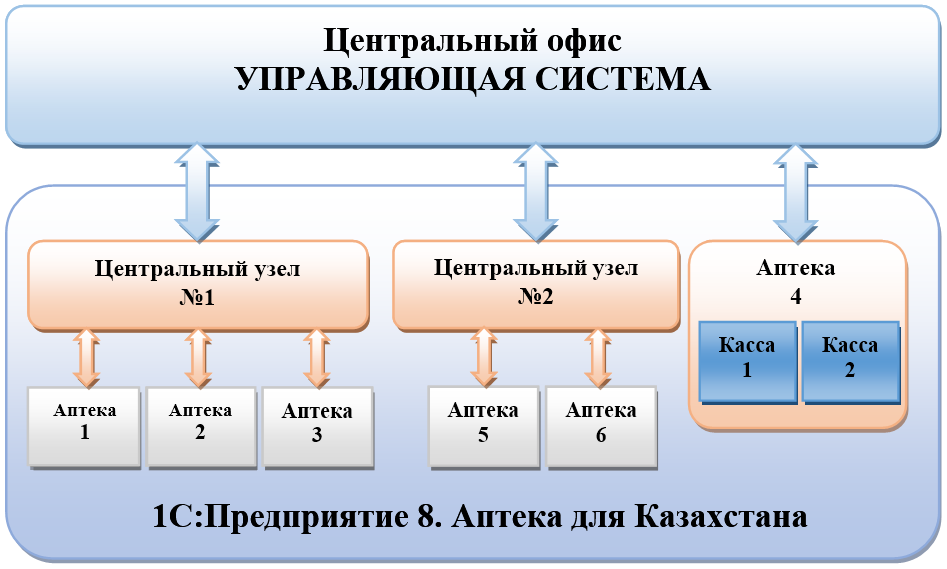 Описанная выше структура сети поддерживается информационными базами, созданными на основе конфигурации «Аптека для Казахстана». Программа предоставляет возможность работы в режиме распределенных информационных баз на двух уровнях: по аптечным магазинам и по рабочим местам кассира.