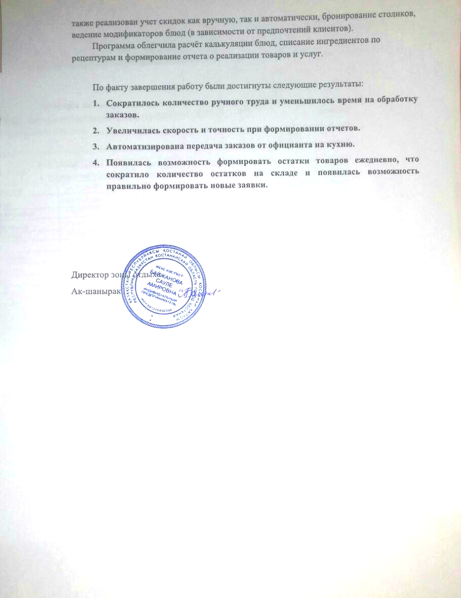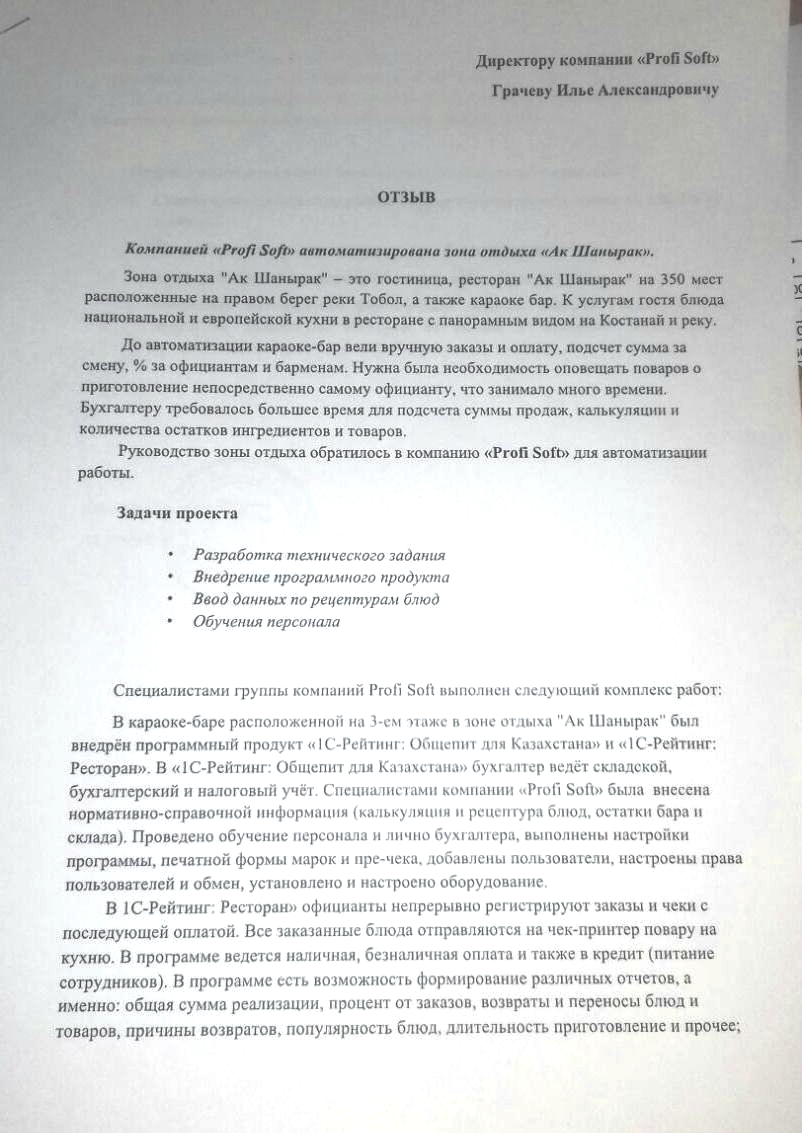 Преследуя цель автоматизировать работу официантов, кухни и бара, а также объединить учет в едином информационном пространстве представители комплекса «Ак Шанырак» обратились к специалистам компании «ProfiSoft».