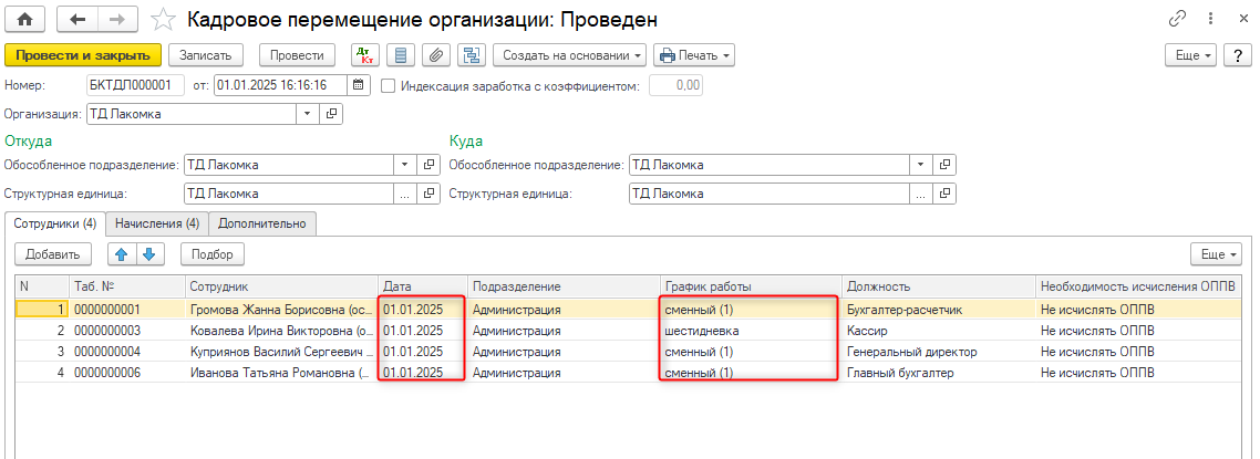 Для выбора другого графика работы необходимо сформировать кадровые перемещения сотрудников и назначить графики