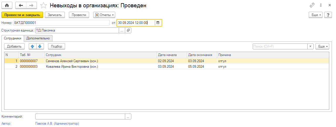 Для регистрации неоплачиваемого невыхода работника предусмотрен документ Невыходы в организациях.