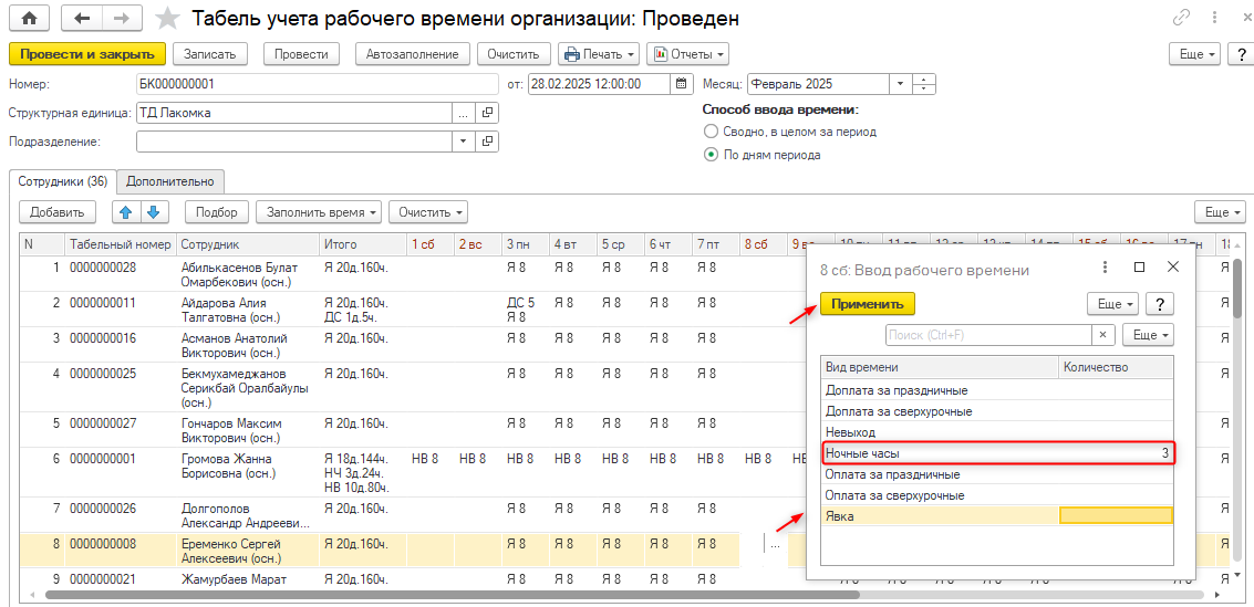 — заполнить по графику для всех или для текущего сотрудника с учетом невыходов. Явка и ночные часы заполняются