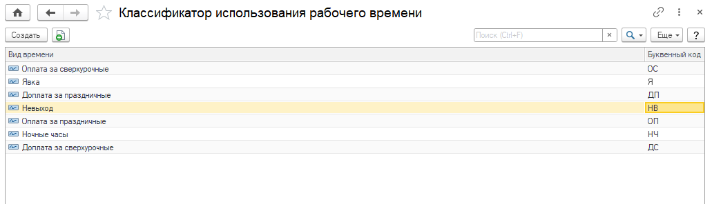 Регистр сведений «Классификатор использования рабочего времени» предназначен для задания соответствий