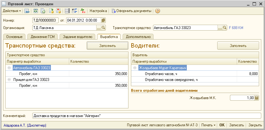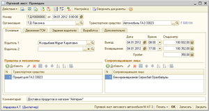 При оформлении в учетной системе путевых листов, заполняются как общие для большинства путевых листов сведения (транспортное средство, водители, показания спидометра, пробег, прицепы, сопровождающие лица, сведения о маршруте движения и задании водителю), так и сведения, которые используются в целях разного рода вычислений, например для расчета нормы расхода ГСМ, расчета заработной платы водителей, износа шин и аккумуляторов и т.д.