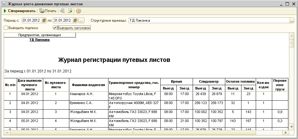 Список путевых листов, зарегистрированных в учетной системе, можно вывести на печать с помощью отчета «Журнал учета путевых листов».