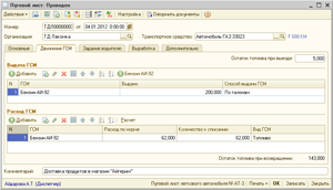 Учет выданных ГСМ ведется по маркам ГСМ, транспортным средствам и способам выдачи. Сведения о количестве выданных ГСМ регистрируются в документе «Заправочная ведомость» или непосредственно в документе «Путевой лист».