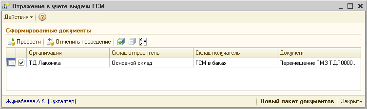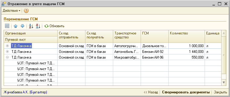 При нажатии на кнопку «Далее» открывается окно с табличной частью «Перемещение ГСМ», в которой можно посмотреть и отредактировать значения реквизитов формируемых документов.