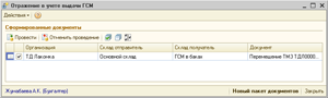 Отражение операций выдачи ГСМ в бухгалтерском учете выполняется документом «Перемещение ТМЗ» основной конфигурации. Автоматическое заполнение документов «Перемещение ТМЗ» производится по данным табличной части «ГСМ».