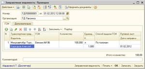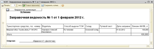 Документ «Заправочная ведомость», предназначен для отражения в оперативном учете выдачи ГСМ для списка транспортных средств.