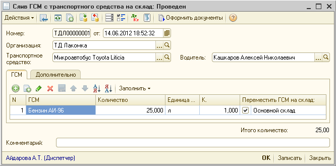 Слив ГСМ оформляется документом «Слив ГСМ с транспортного средства».