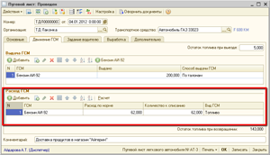 Количество ГСМ, которое будет списано при проведении документа «Путевой лист», определяется значением реквизита «Количество к списанию» табличной части «Расход ГСМ» для соответствующей марки ГСМ.