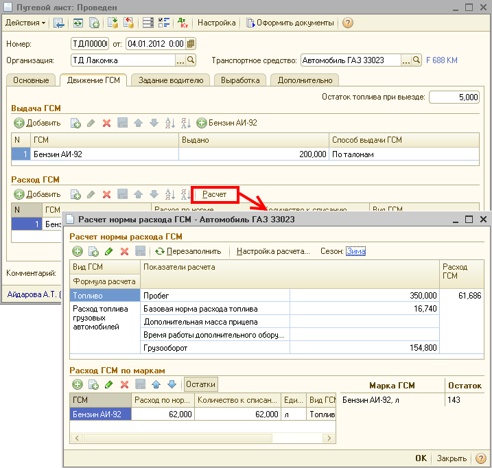 Расчет нормы расхода ГСМ выполняется в документе «Путевой лист» с использованием произвольных формул расчета, определяемых пользователем в соответствии с учетной политикой предприятия. Норма расхода и количество ГСМ к списанию указывается в табличной части «Расход ГСМ».