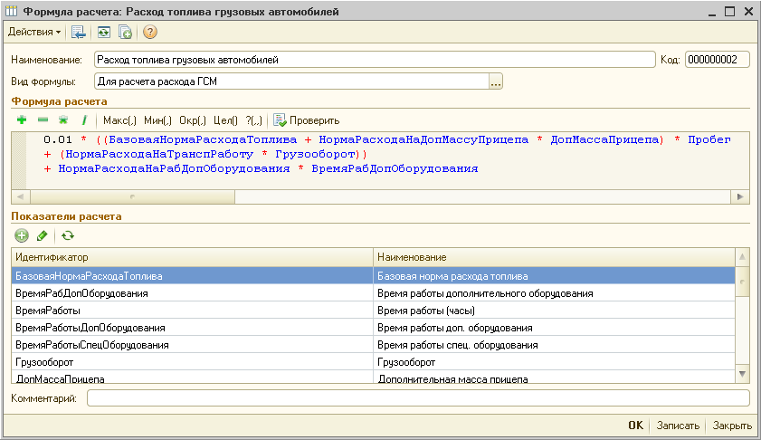 На основании сведений об объеме выполненных работ (таких как пробег, отработанное время, количество технологических операций и т.д.), норм расхода и различных коэффициентов, учитывающих специфику эксплуатации транспортных средств (например, сезонные изменения расхода), в документе «Путевой лист» выполняется расчет нормы расхода по произвольным формулам. Для расчета могут использоваться как предопределенные формулы расчета, так и формулы, добавленные пользователем.
