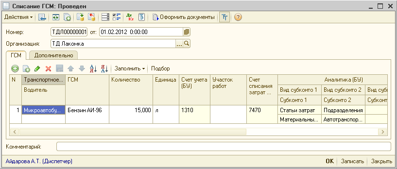 Для списания ГСМ предназначены документы «Путевой лист» и «Списание ГСМ».
