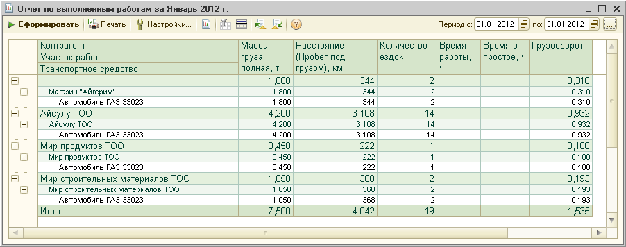 Отчет «Отчет по выполненным работам» предназначен для получения информация о выполненных работах в разрезе транспортных средств, заказчиков и участков работ.