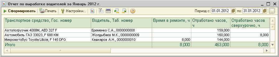В конфигурации предусмотрен ряд специализированных отчетов, предназначенных для анализа результатов работы транспортных средств и водителей.