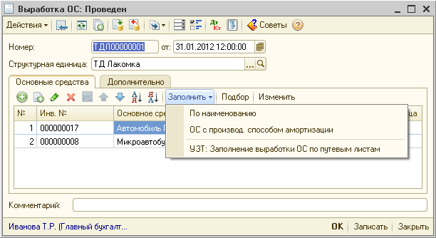Предусмотрена возможность автоматического заполнения документа «Выработка ОС» основной конфигурации по сведениям о выработке транспортных средств. Для этого, необходимо в меню «Заполнить» командной панели документа «Выработка ОС» выбрать пункт «УЗТ: Заполнение выработки ОС по путевым листам».